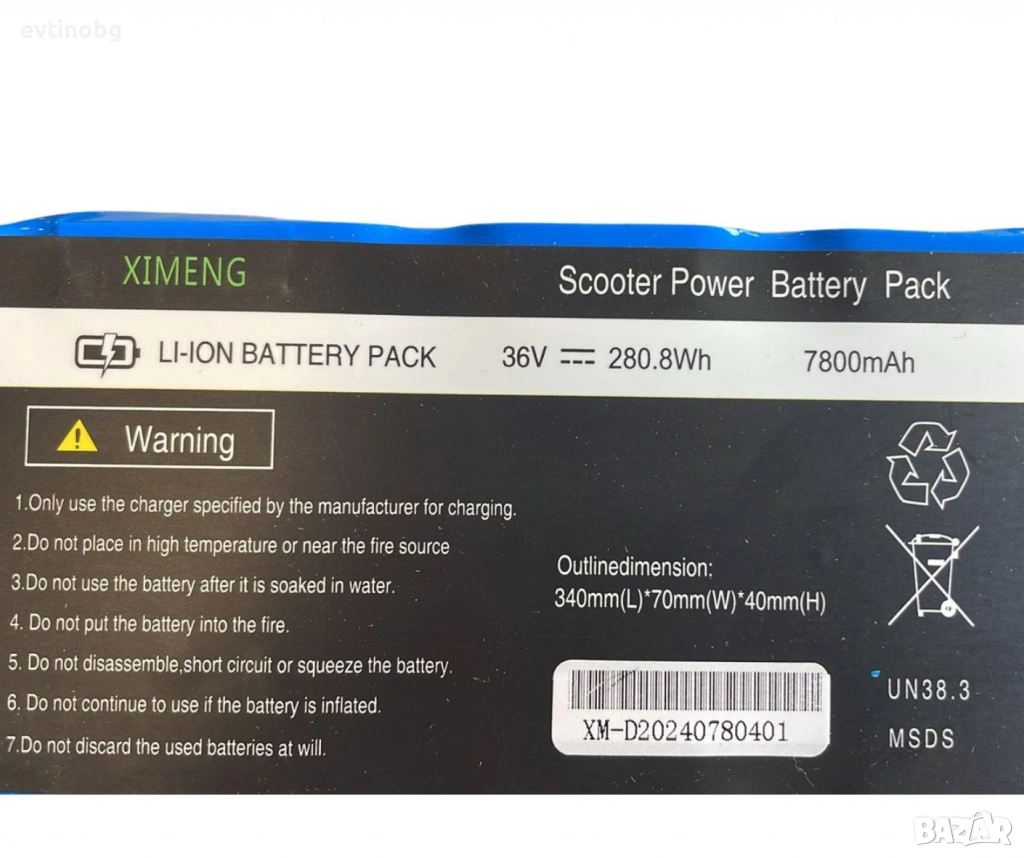 Модел: 36V 7.8Ah, 280Wh; Номинално напрежение: 36V; Максимално напрежение: 42V; Капацитет: 7.8Ah; Енергийна плътност: 280Wh; Максимален ток на зареждане: 2A; Граничен ток: 18A; Тип батерия: Литиево-йонна; Размери: 40x70x335мм; Цвят: Син; Съвместимост: Подходяща за електрически велосипеди и скутериz.