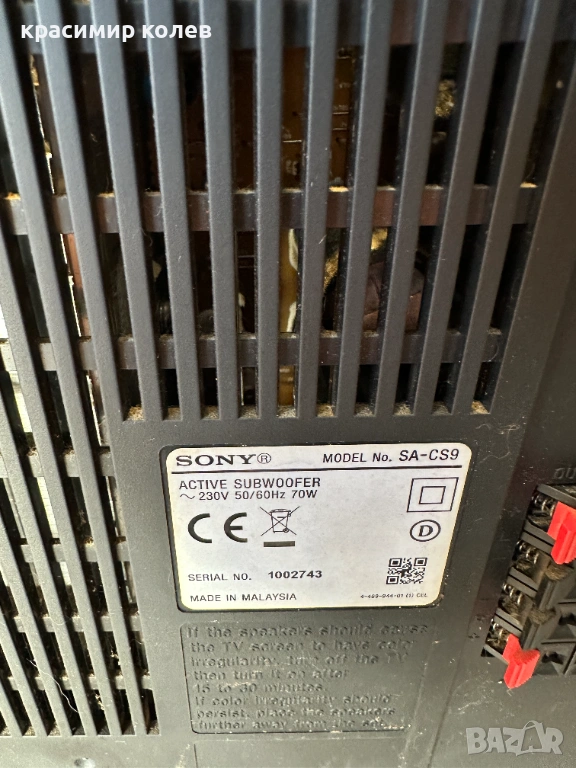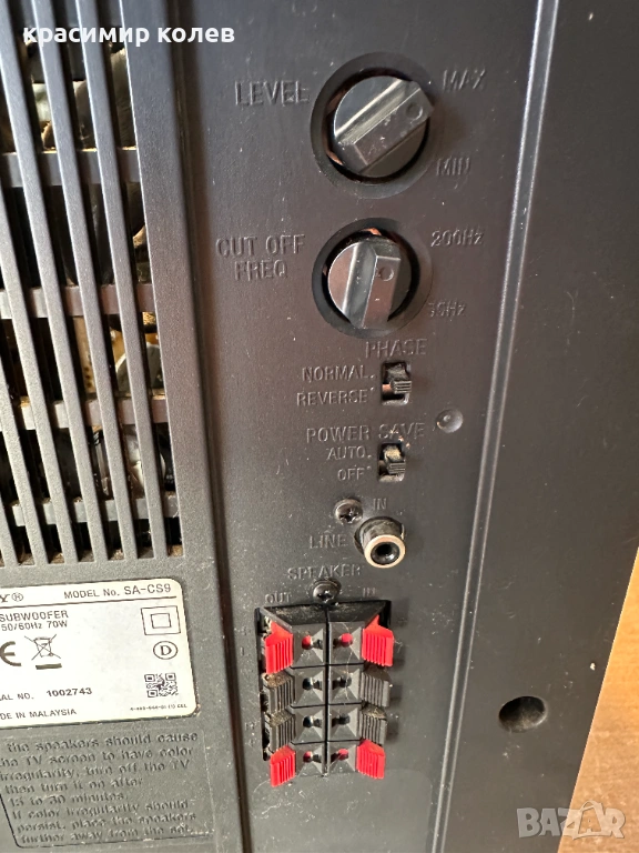 Добро техническо и визуално състояние.Активният субуфер Sony SA-CS9 е част от серията "Core" на Sony и е проектиран да добави дълбочина и мощност към домашната аудио система или домашно кино. Той разполага с 10-инчов (250 мм) високоговорител и вграден усилвател с максимална изходна мощност от 115W.