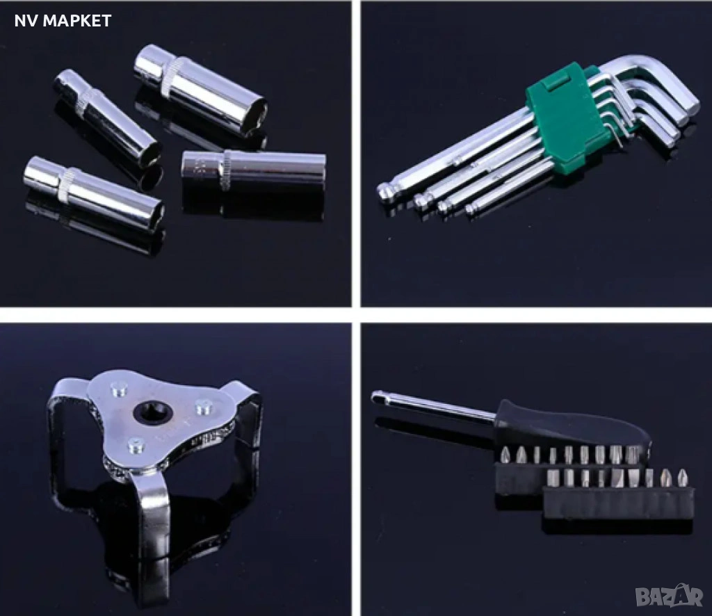 Комбинирани инструменти като ключове (wrench), накрайници (socket), плъзгачи (slider), еластични стълбове и удължителни пръти; Комплектът съдържа набор от накрайници, ключове и отвертки, които покриват широк спектър от автомобилни ремонти и поддръжка.