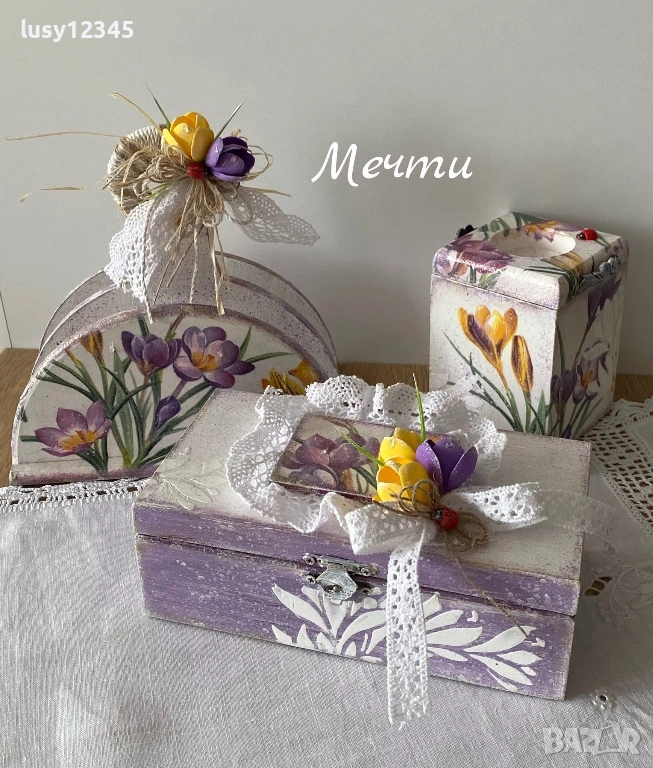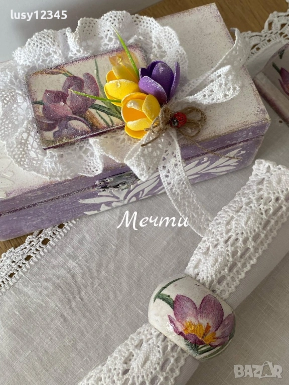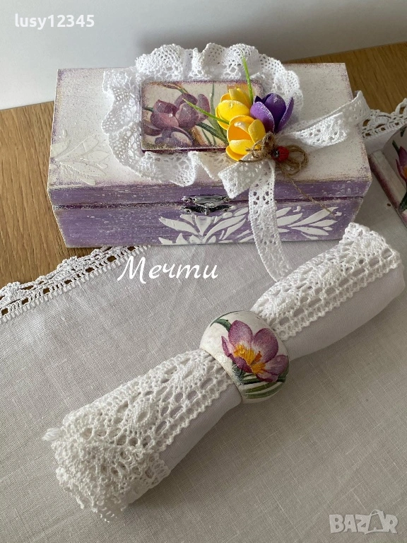 Дървена кутия с 6 пръстена за салфетки с пролетни минзухари, декорирана с декупаж, дантела, ръчно изработени минзухари…🍽️🥂🍾