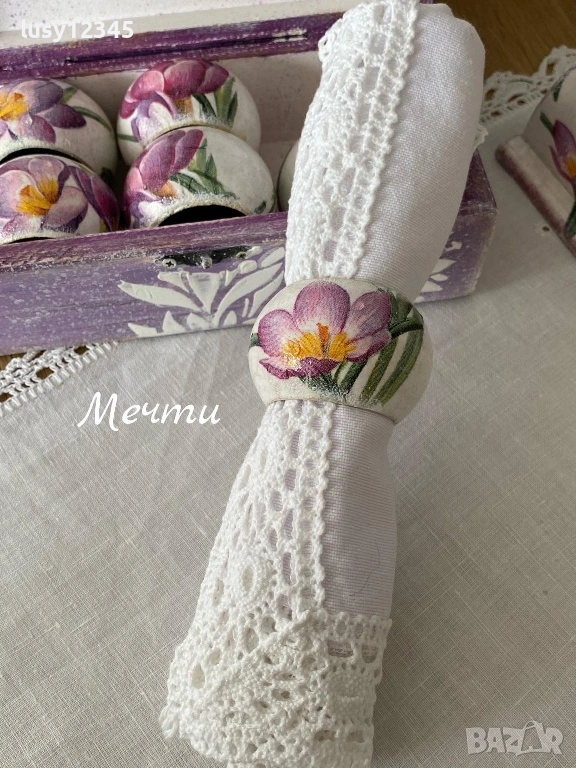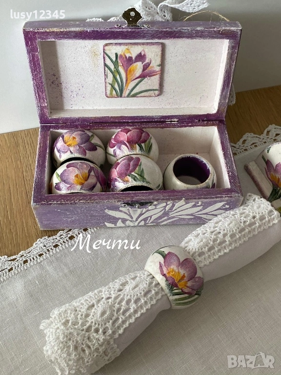 Дървена кутия с 6 пръстена за салфетки с пролетни минзухари → Обява 53843048