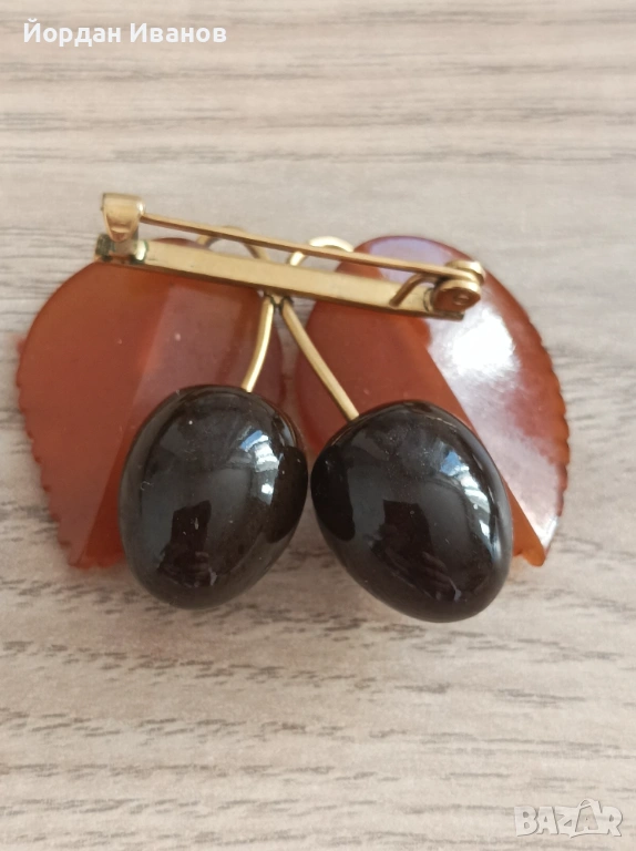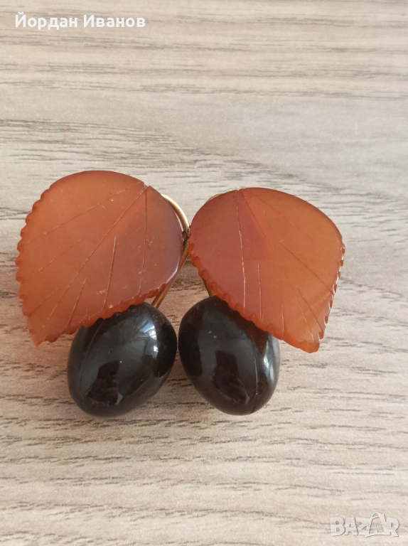 Предлагам кехлибарена брошка с позлата на Калининградския завод за кехлибар.Брошката е от серията плодове "Слива"рядък модел в отлично състояние
