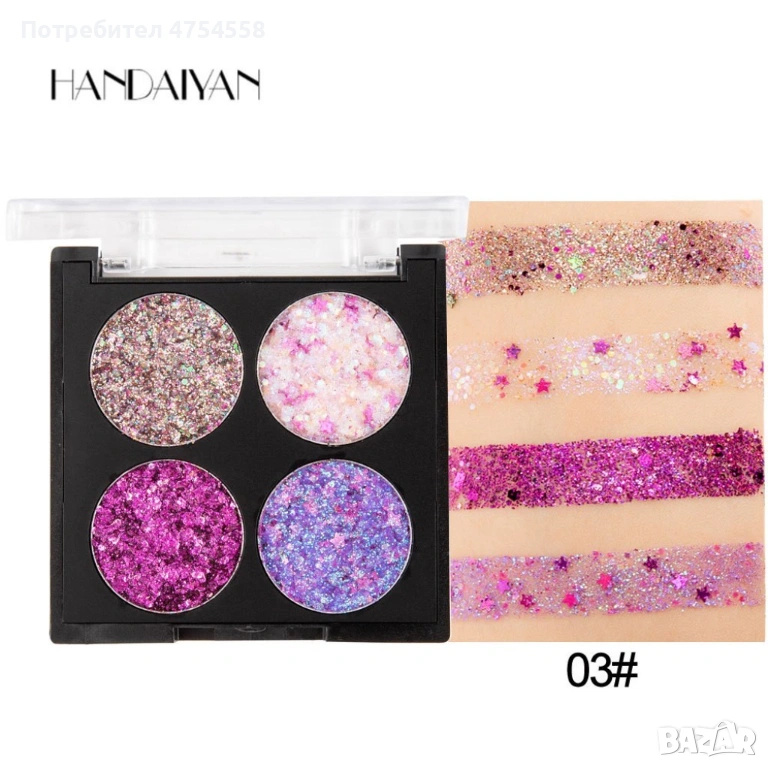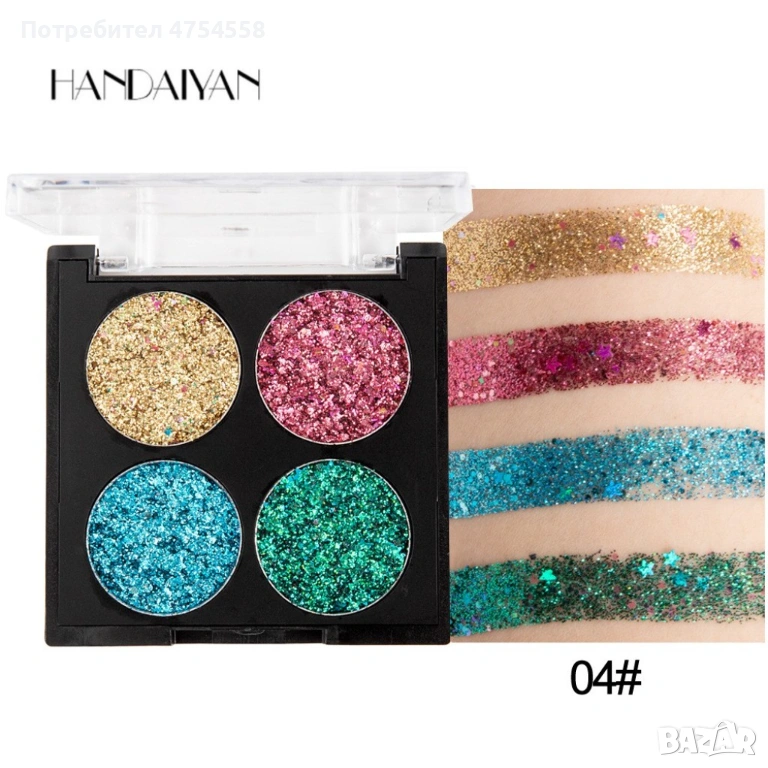 Водоустойчива диамантена палитра сенки за очи с 4 броя цвята Han Daiyan HZS335, снимка 1 - Декоративна козметика - 53843532 Водоустойчива диамантена палитра сенки за очи с 4 броя цвята Han Daiyan HZS335, снимка 2 - Декоративна козметика - 53843532 Водоустойчива диамантена палитра сенки за очи с 4 броя цвята Han Daiyan HZS335, снимка 3 - Декоративна козметика - 53843532 1/3