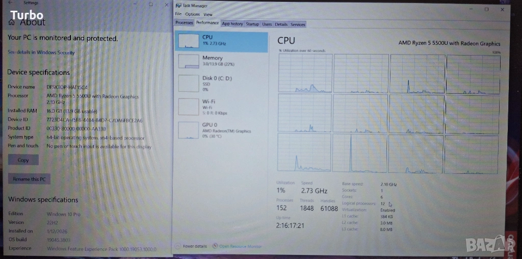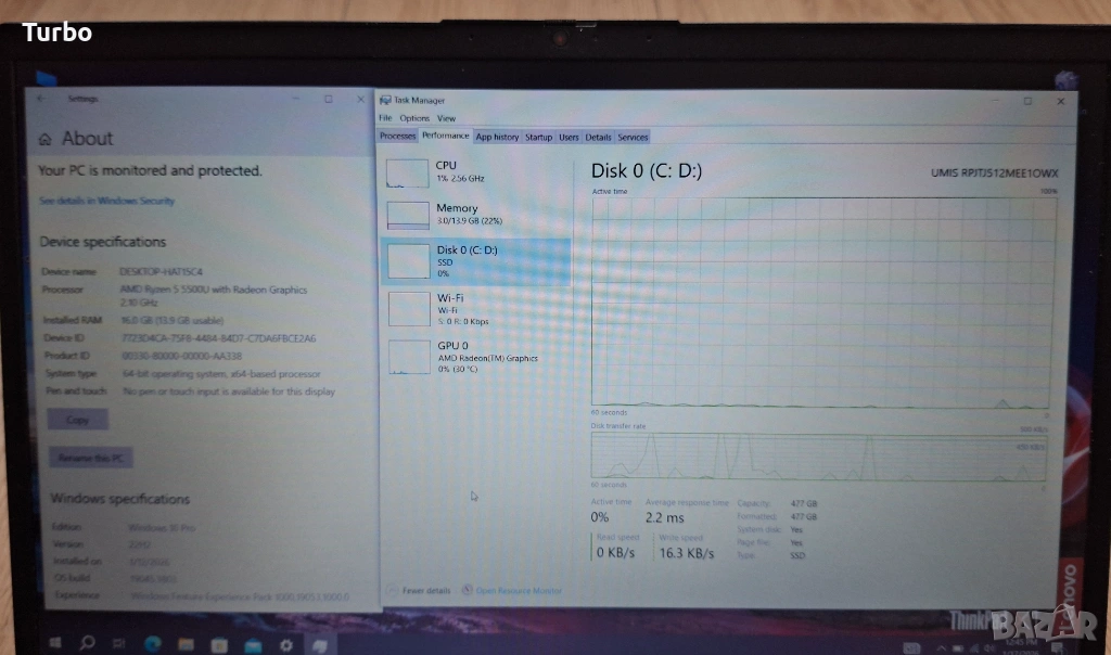 Лаптопът е като нов и е технически безупречен. Качествен ултрабук от серията V14 на Lenovo. Разполага с брутално мощен 6-ядрен, 12- ишков процесор AMD Ryzen™ 5 5500U (12x4.0GHz), видеокарта AMD Radeon RX Vega 7 със собствена 2GB GDDR4 памет и бърза 16GB DDR4 3200MHz РАМ памет. Голям 512GB SSD NVMe диск.