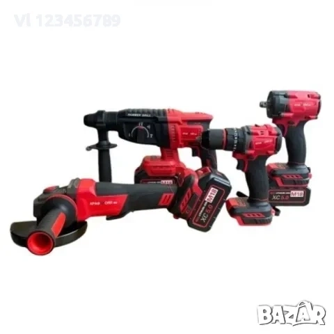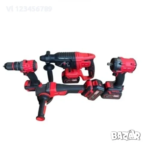 Комплект от акумулаторен перфоратор, ъглошлайф 125 мм, гайковерт и винтоверт 36V с 3 броя батерии 8Ah в куфар и зарядно KraftRoyal Red Mx Fuel