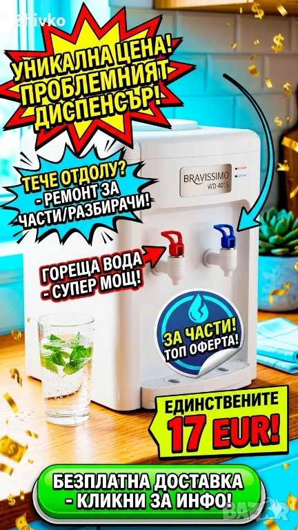 Продавам компактен и практичен диспенсър за вода Bravissimo, модел WD 4015. Уредът е подходящ както за дома, така и за малък офис. Разполага с два чучура: