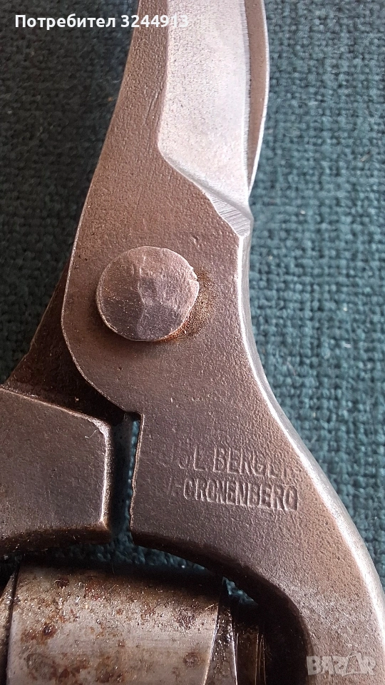 Стара лозарска ножица (лозаро- цветарски инструмент) Марка: Berger, произведени в Oronenberg Германия началото на 20 ти век. Тип: Ръчна ножица за рязане на лозя и цветя . Характеристики: Метален корпус с характерен пружинен механизъм в центъра. Работи перфектно. Цена 25€ изпращам с ЕКОНТ преглед и тест. Моля разгледайте и другите ми предложения.