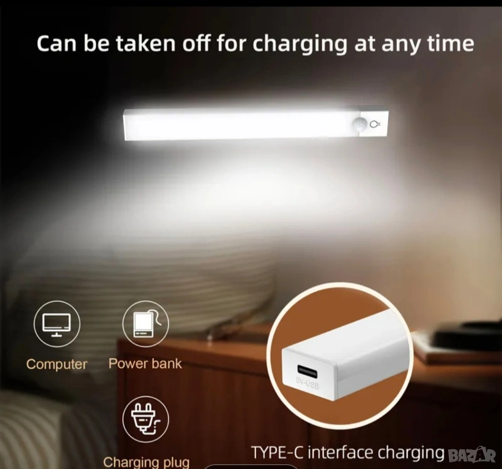 Модерна LED лампа с елегантен дизайн. Предлага се в бял цвят. Подходяща за монтаж в дома или офиса. NBBUFF LED лампа с движение, регулируема яркост, 360° панорамен сензор за хора и USB презареждане. Идеална за използване в спални, до легла, на стълби, в шкафове, бюра, гардероби и др