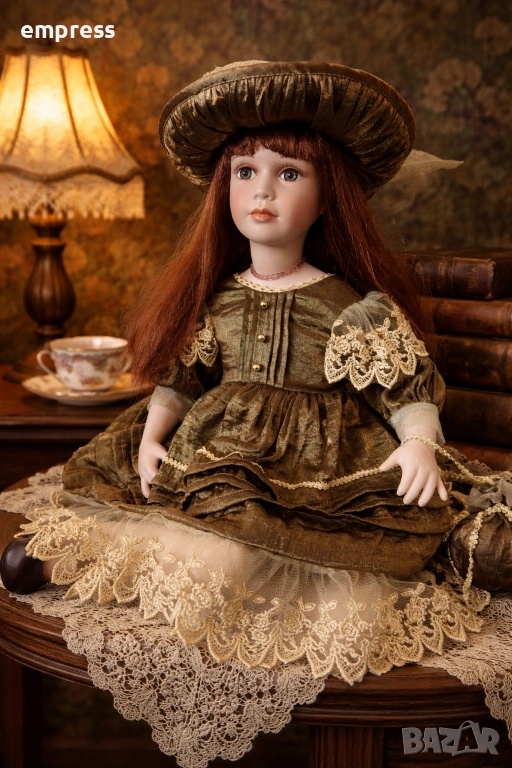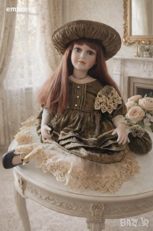 Облеклото е богато и детайлно изработено в класически винтидж стил. Куклата носи елегантна рокля от маслинено-кафява материя с мек блясък, украсена с фини плисета и декоративни копчета отпред. Ръкавите са декорирани с нежна кремава дантела, а подгъвът на роклята завършва с красив слой тюл и богата бродирана дантела, която придава допълнителна обемност и изисканост. Към тоалета е добавена и широка шапка от същата материя, която хармонично допълва визията и придава на куклата характерен старинен чар. Фините детайли в облеклото, включително дантелените елементи и малките декоративни акценти, създават усещане за стил и внимателна изработка.