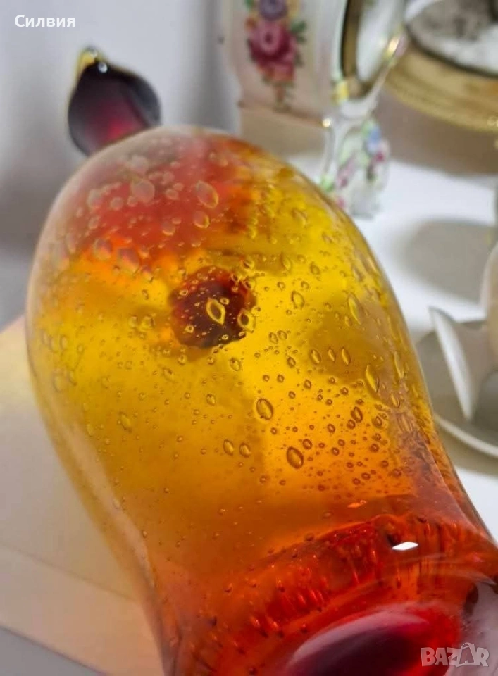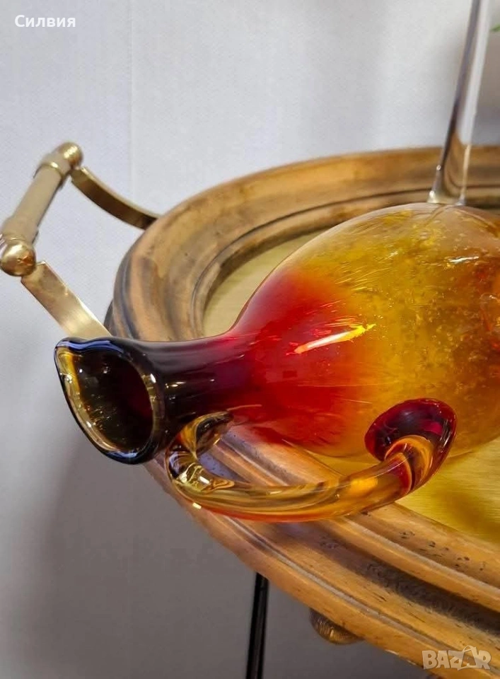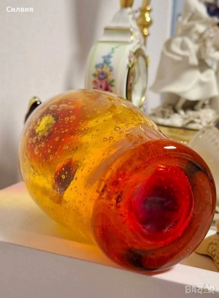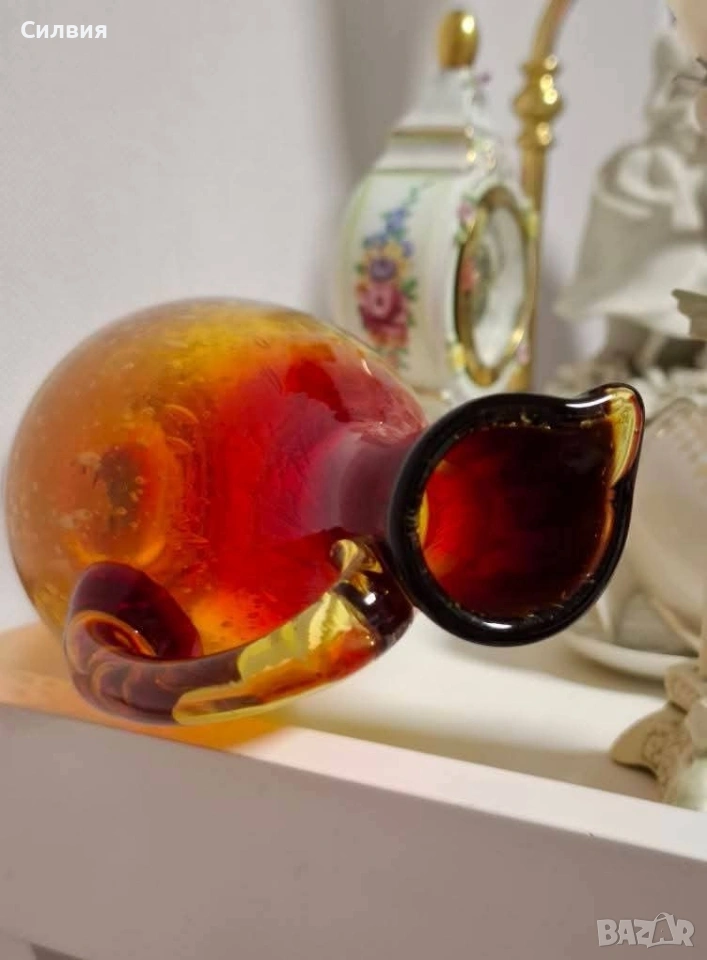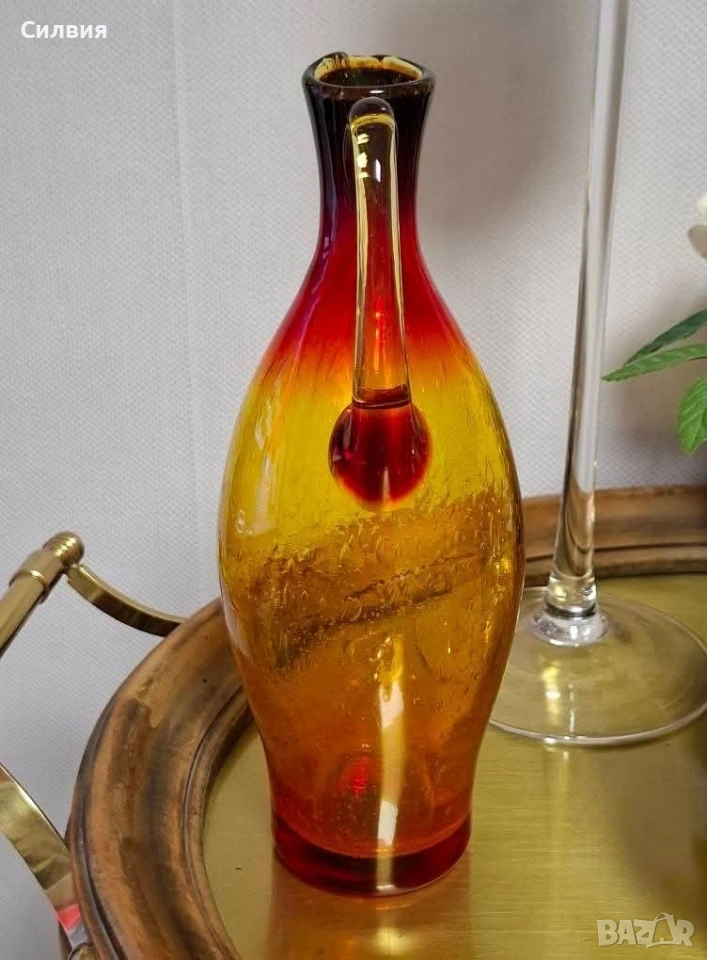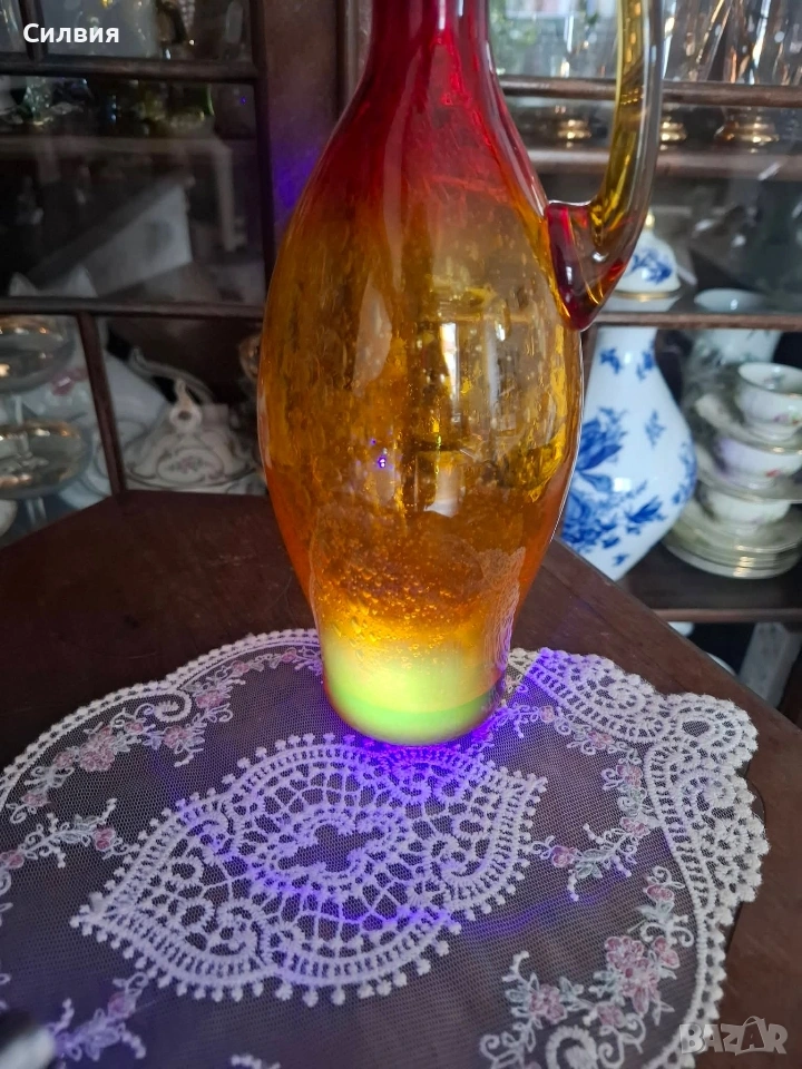 Ръчно духана винтидж стомна | Amberina Ombré Art Glass с „Ураново“ сияние Атрактивен акцент за ценители на антикварната атмосфера и редките стъклени находки. Великолепен Amberina градиент – плавно преливане от наситено рубиненочервено към топъл кехлибар. Корпусът е изработен по метода Bullicante с контролирани въздушни мехурчета, които улавят светлината и създават триизмерен ефект. Скритото съкровище (UV Glow): Стъклото притежава магическо свойство – под въздействието на ултравиолетова светлина (UV), жълтата част на каната излъчва яркозелена флуоресценция. Това показва присъствието на уран в състава, което я прави силно желан колекционерски обект (Uranium/Vaseline Glass). Комбинацията от червена „Амберина“ и уранова флуоресценция е по-рядка от стандартното зелено ураново стъкло. Детайли на изработката: Ръчно приложена дръжка в контрастен цвят. Полиран понтил (Polished Pontil) на дъното – белег за висок клас ръчна изработка, характерен за майсторите от Мурано (Италия) или елитни студиа от 50-те/60-те години. Размери: Височина 25 см; Диаметър на основата 6.5 см. Цена 8️⃣0️⃣€ 156,47лв ❥⊱╮🩷☆♪ ░─❥⊱🩷✿L░o░V░e░❥─❥⊱🩷✿⊱╮🩷☆♪ღ