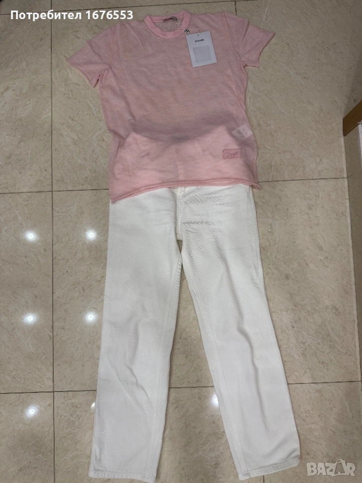 Тениската е чисто нова с етикет на Chanel. Дънките са на prada, също могат да се продадат за 100 евро
