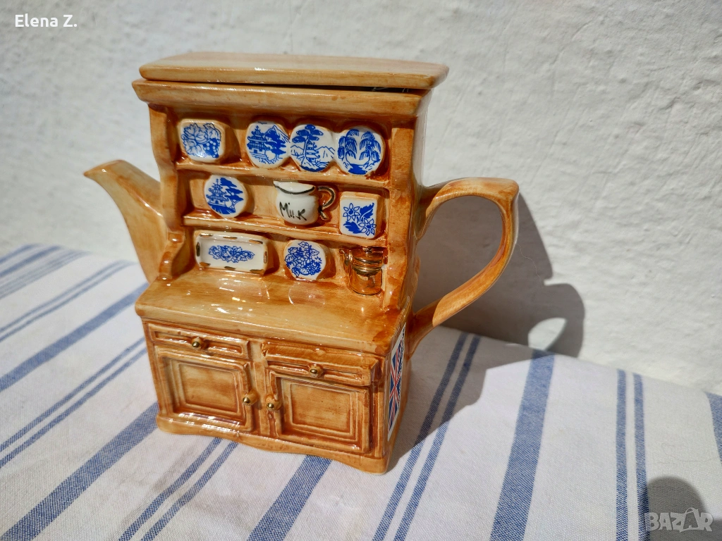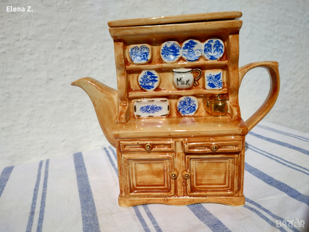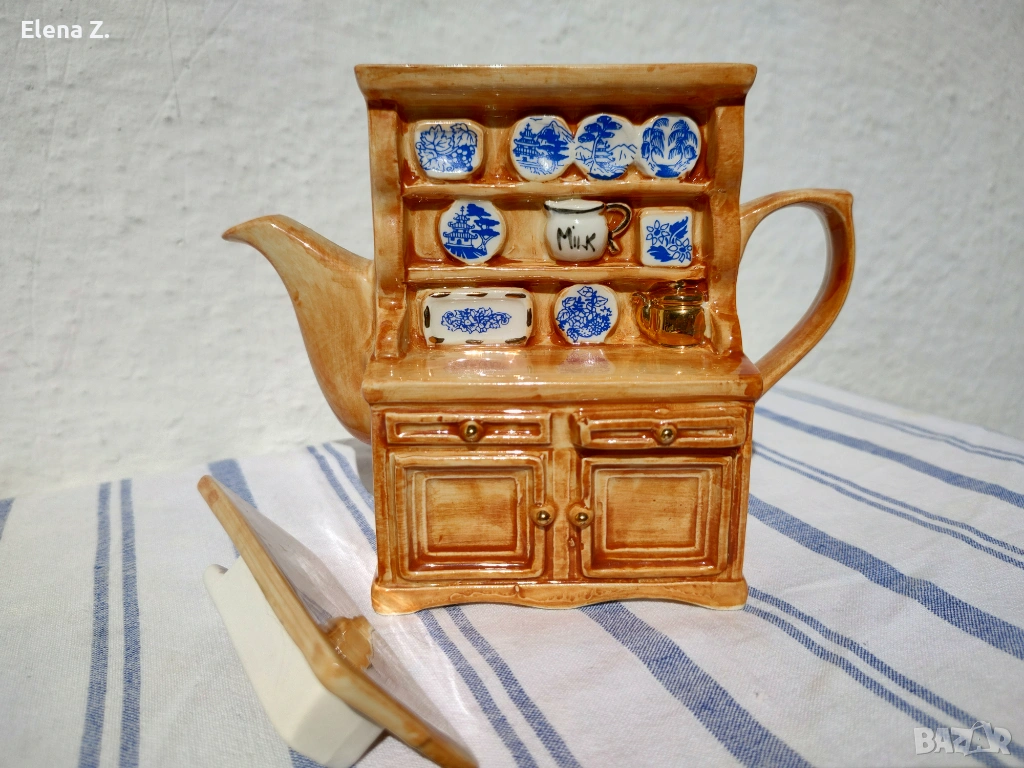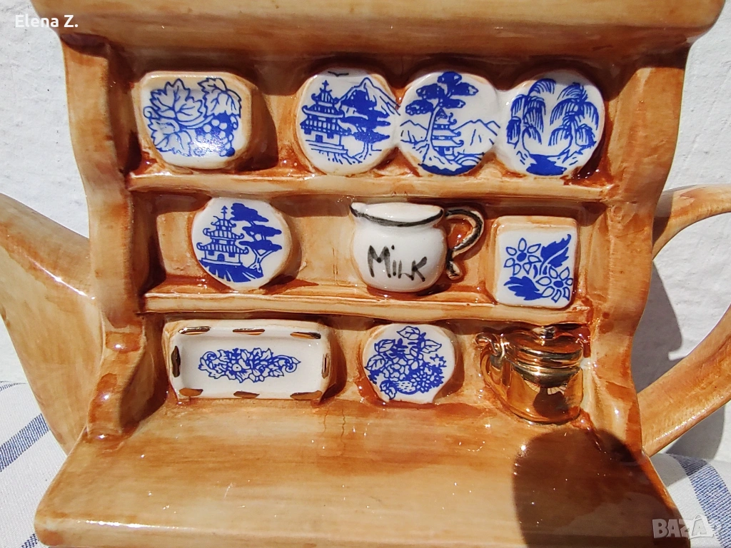 Малък ръчно изработен чайник за една чаша чай на Swineside Teapottery (днес известни като ceramic Inspirations). Ръчно изработен, декориран и боядисан във формата на малък дървен шкаф с чинии и съдове от известната синьо-бяло-златна серия Blue Willow. “Меден” чайник и други симпатични детайли.