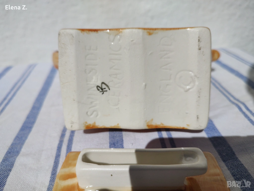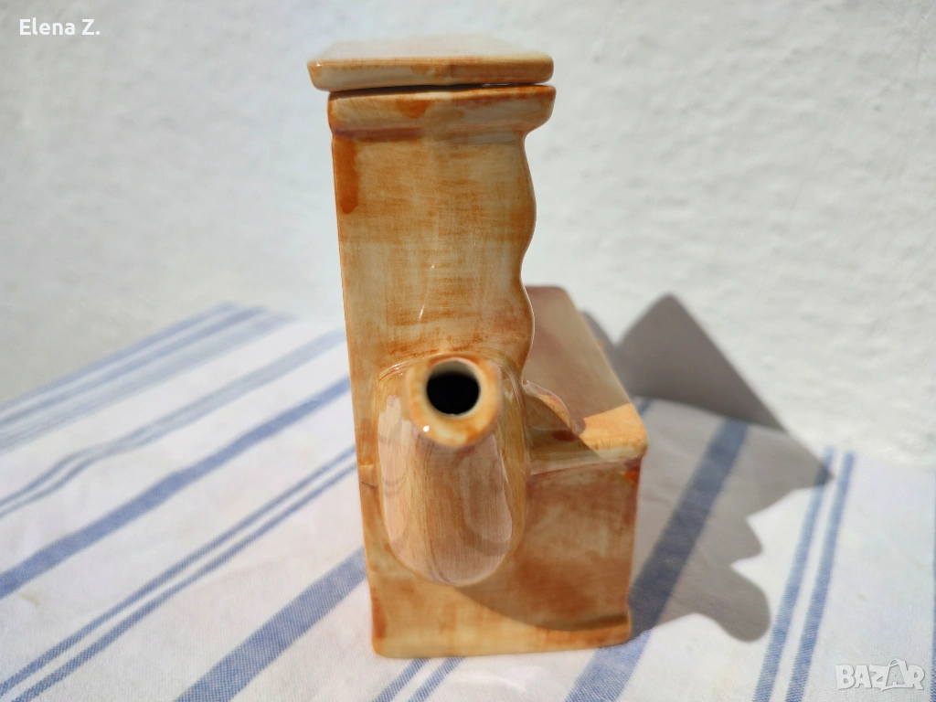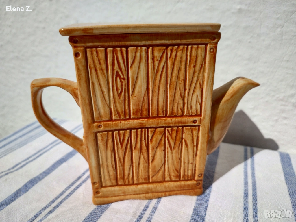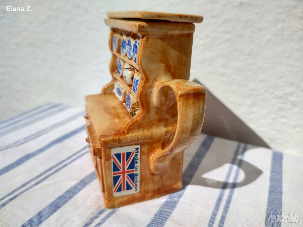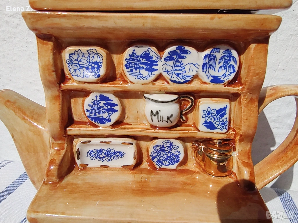 Малък ръчно изработен чайник за една чаша чай на Swineside Teapottery (днес известни като ceramic Inspirations). Ръчно изработен, декориран и боядисан във формата на малък дървен шкаф с чинии и съдове от известната синьо-бяло-златна серия Blue Willow. “Меден” чайник и други симпатични детайли.