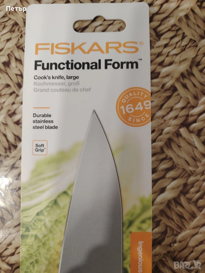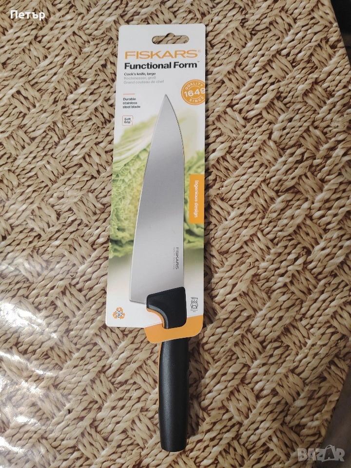 Голям готварски нож Fiskars , снимка 1 - Форми - 53845325 Голям готварски нож Fiskars , снимка 2 - Форми - 53845325 Голям готварски нож Fiskars , снимка 3 - Форми - 53845325 Голям готварски нож Fiskars , снимка 4 - Форми - 53845325 1/4