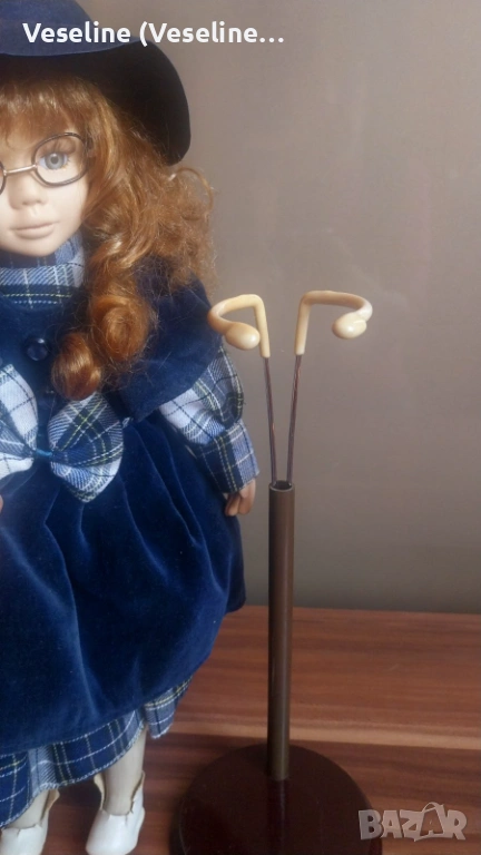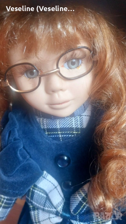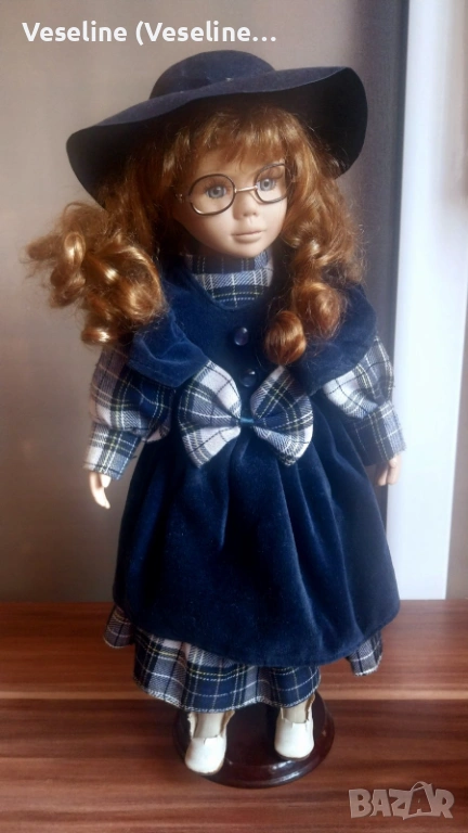 Порцеланова кукла - 40см. Много елегантен модел с очила, шапка и стилна рокля в тъмносиньо каре. Куклата има много изразително лице, къдрава коса и фини детайли.