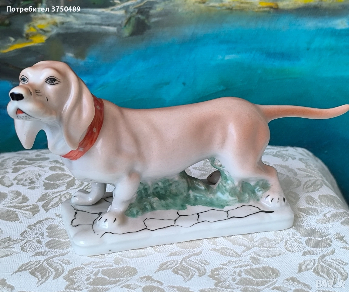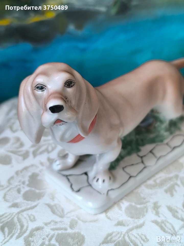 Порцеланова колекционерска статуетка на куче от породата Басет, произведена от румънската компания ARPO.Детайлно ръчно рисувана и маркирана с логото на производителя.