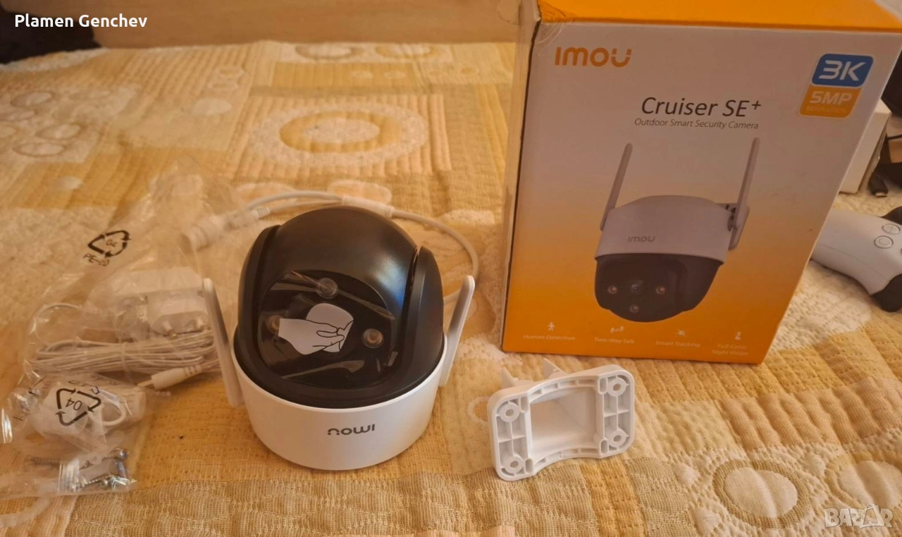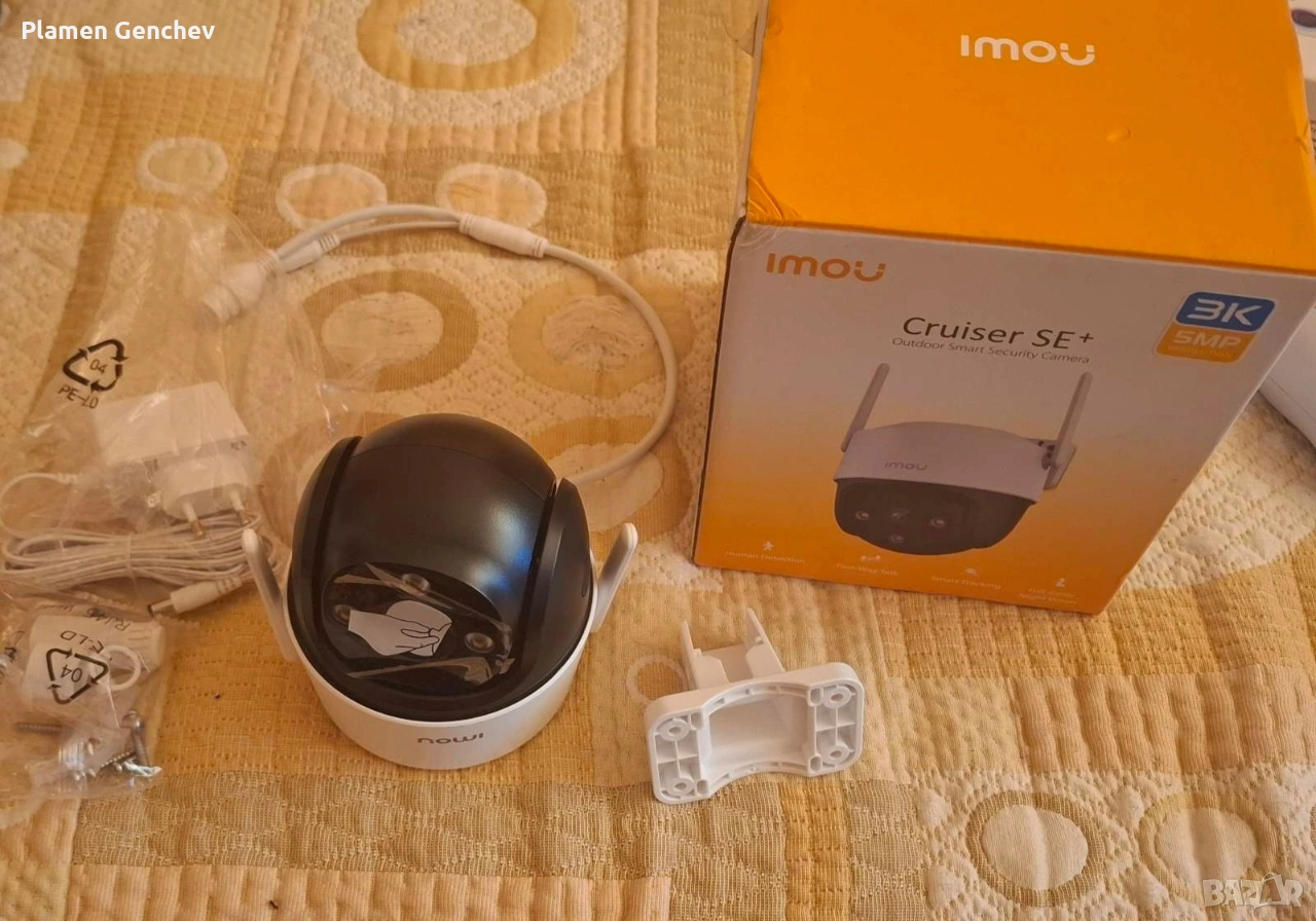IMOU Cruiser SE+ камера за видеонаблюдение, 5MP, черно-бяла, защита IP66, захранване от електрическата мрежа Камерата автоматично проследява движението, като се завърта на 360°. Освен това, камерата открива движение и хора в зрителното си поле. Можете да комуникирате с човека от другия край на камерата, използвайки двупосочен разговор. Камерата може също да издава алармени звуци, за да възпре натрапниците. 2.4 GHz Wi-Fi осигурява лесно свързване с вашата безжична мрежа. Освен това, камерата е устойчива на атмосферни влияния (IP66) и поддържа microSD карти до 256 GB за локално съхранение на записи.
