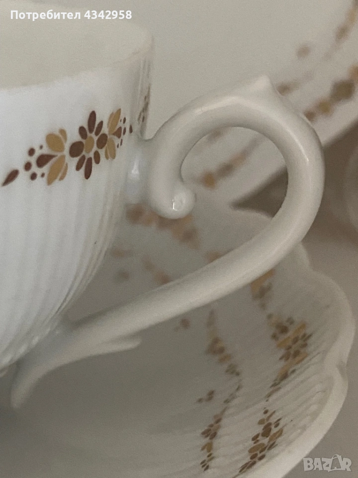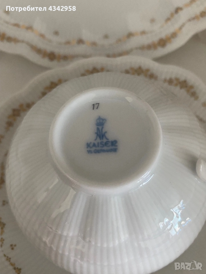 Елегантен винтидж порцеланов комплект от немската марка Kaiser, серия Romantica – Monte Carlo. Произведен в Западна Германия през 1970-те години. Фин бял порцелан с релеф и деликатна златиста декорация по ръба.