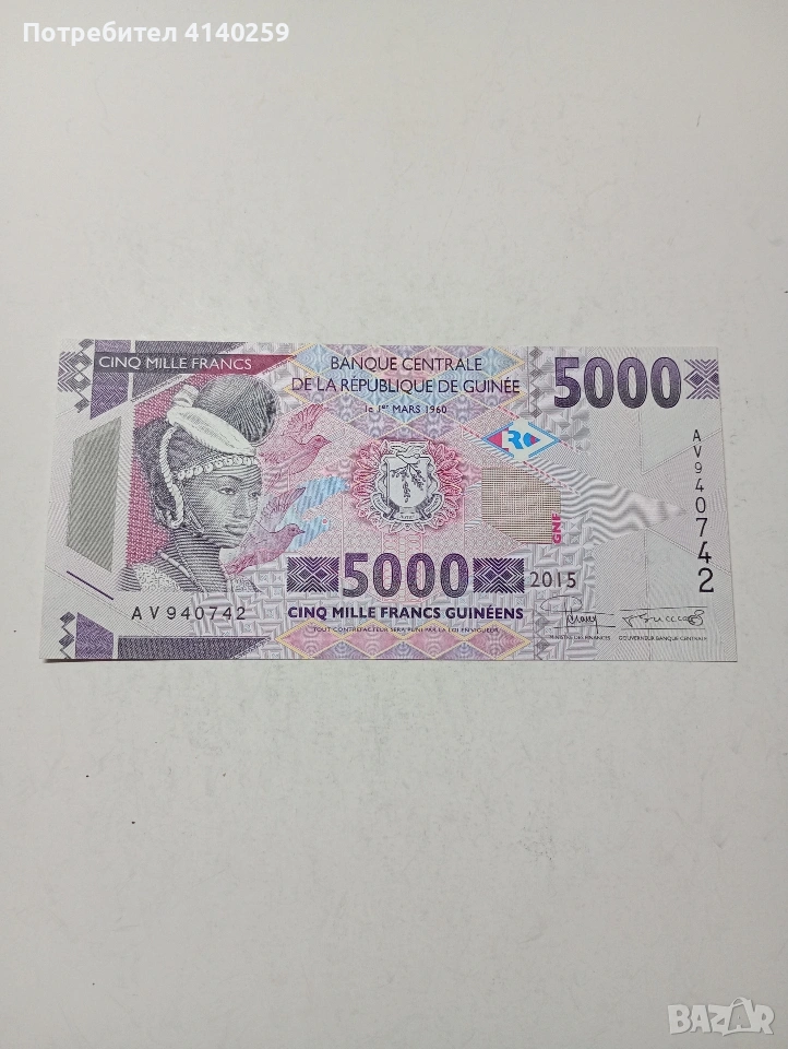 ГВИНЕЯ БАНКНОТА 5,000 ФРАНКА 2015 Г СЪСТОЯНИЕ НОВО ПОЛУЧАВАТЕ СНИМАНАТА БАНКНОТА РАЗГЛЕДАЙТЕ ДРУГИТЕ МИ ОБЯВИ ДА КОМБИНИРАТЕ ДОСТАВКА ЕКОНТ ЗА ВАРНА ЛИЧНО