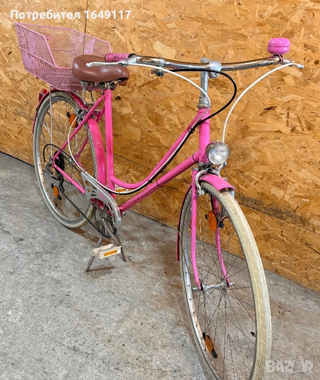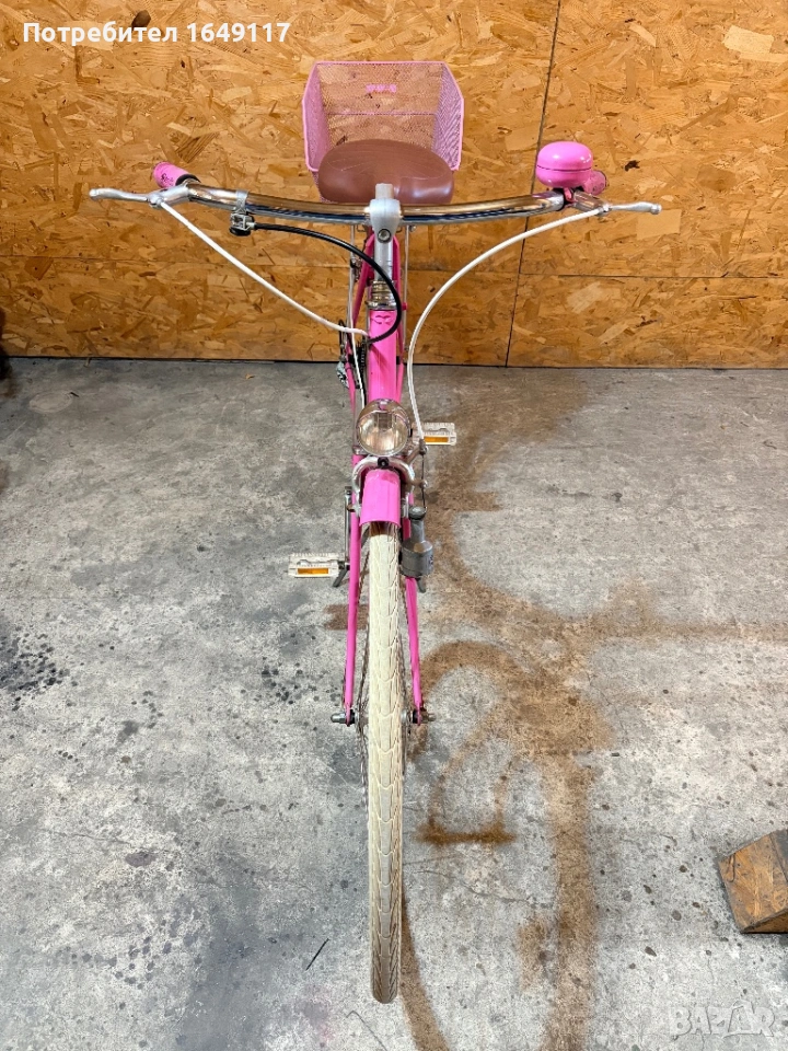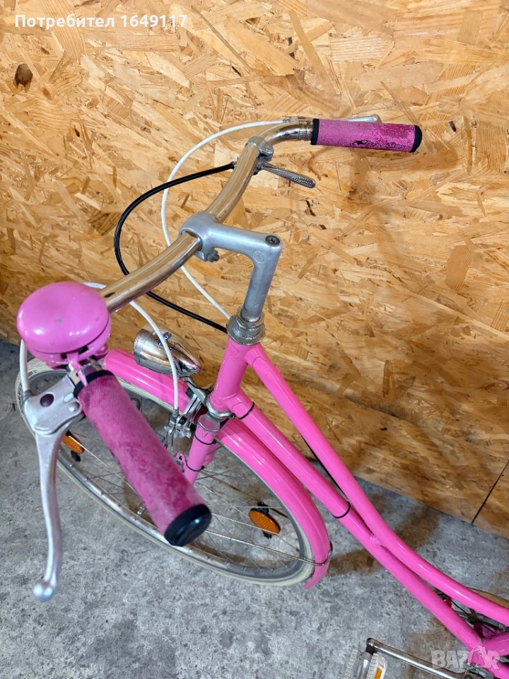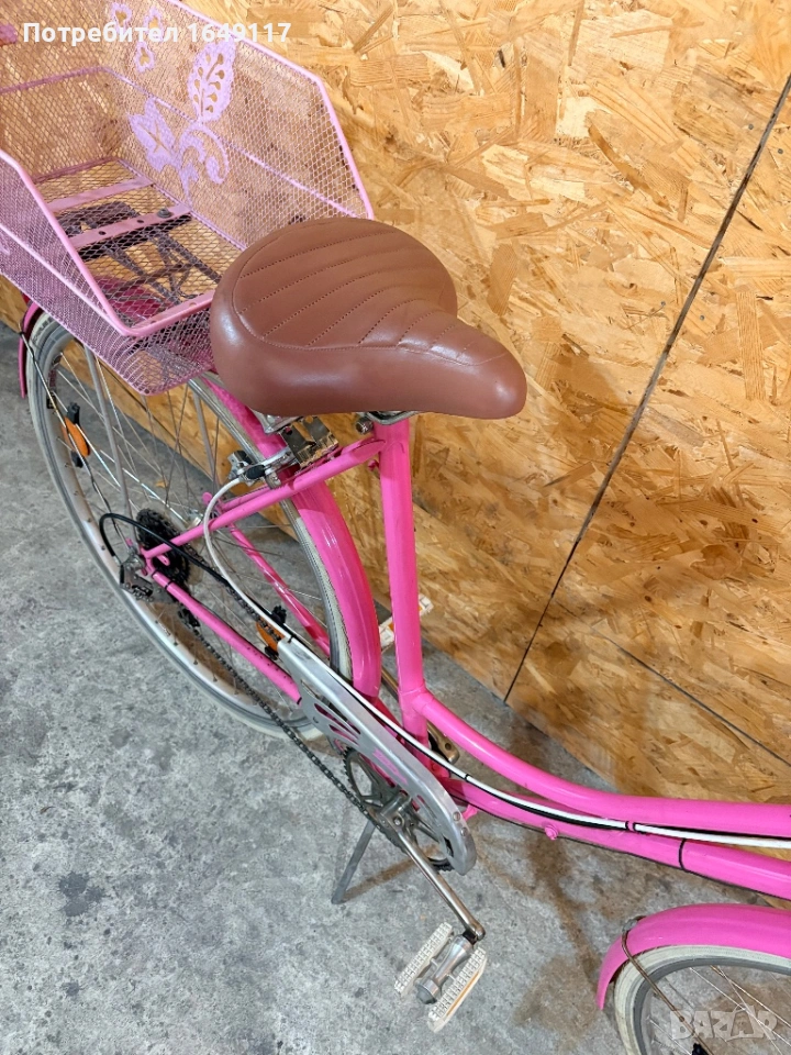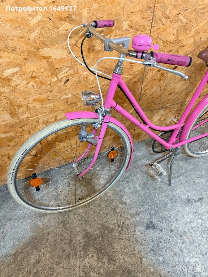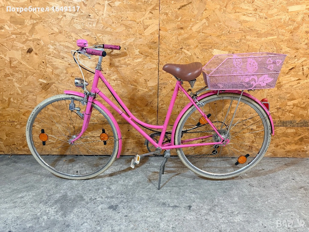 Продавам 28цола, съвсем малко употребяван дамски-градски vintage велосипед. Олекотена, тънкостенна рамка - 52см[стлобка на муфи], с ниско прекрачване. Външни скорости SACHS Huret - 5бр. c палцовa командa. Никелирани курбели с алуминиеви педали. Широка ергономична седалка Felt. Алуминиеви капли с бели гуми Schwalbe Delta Cruiser с усилен профил. Предна и задна алуминиеви челюстни спирачки. Широко кормило с алуминиева лапа.
