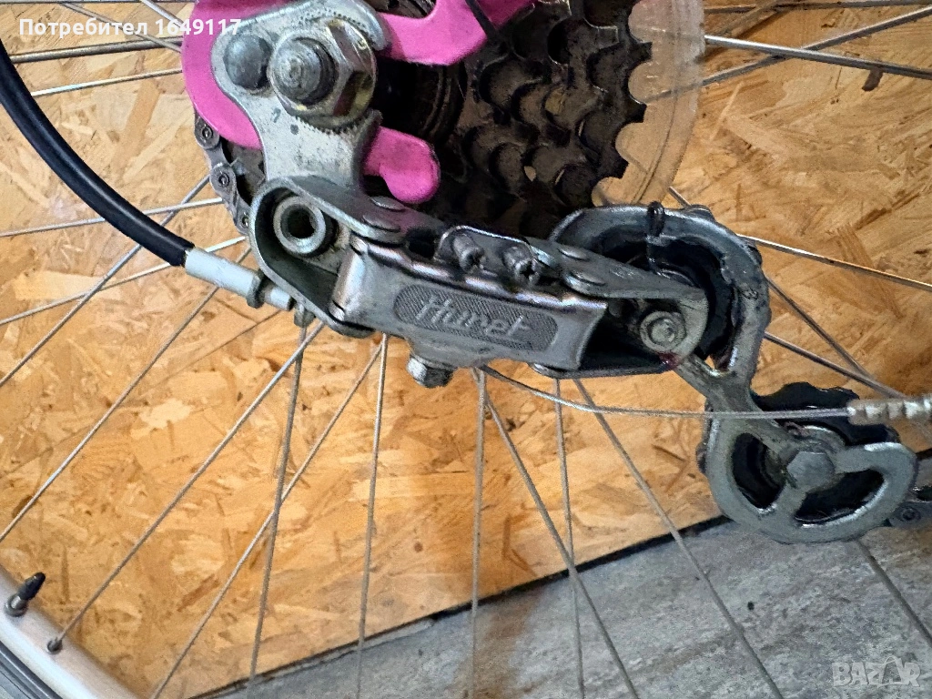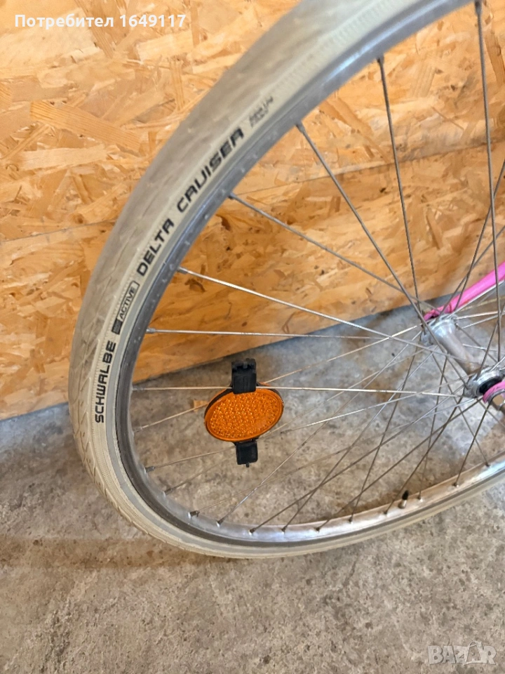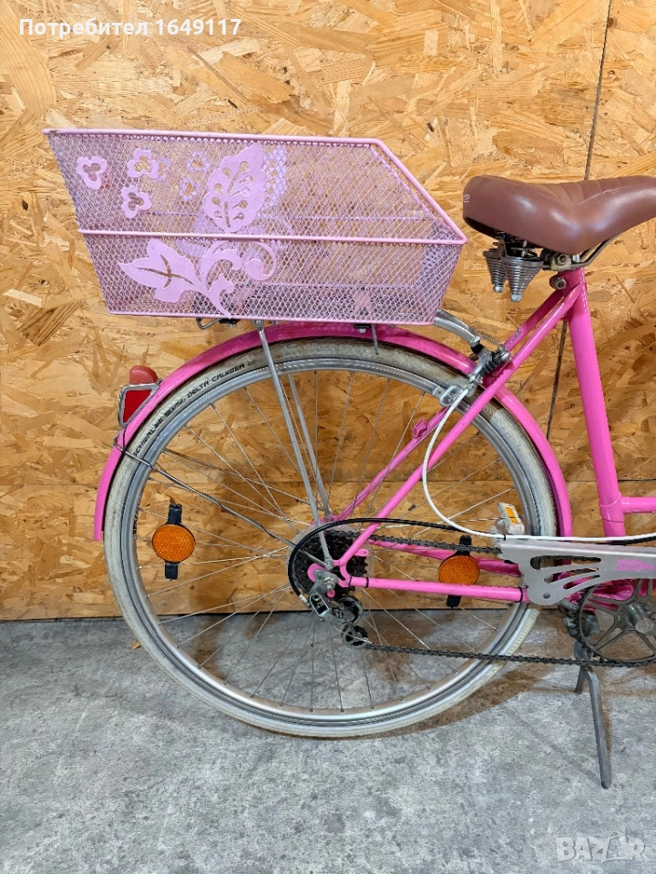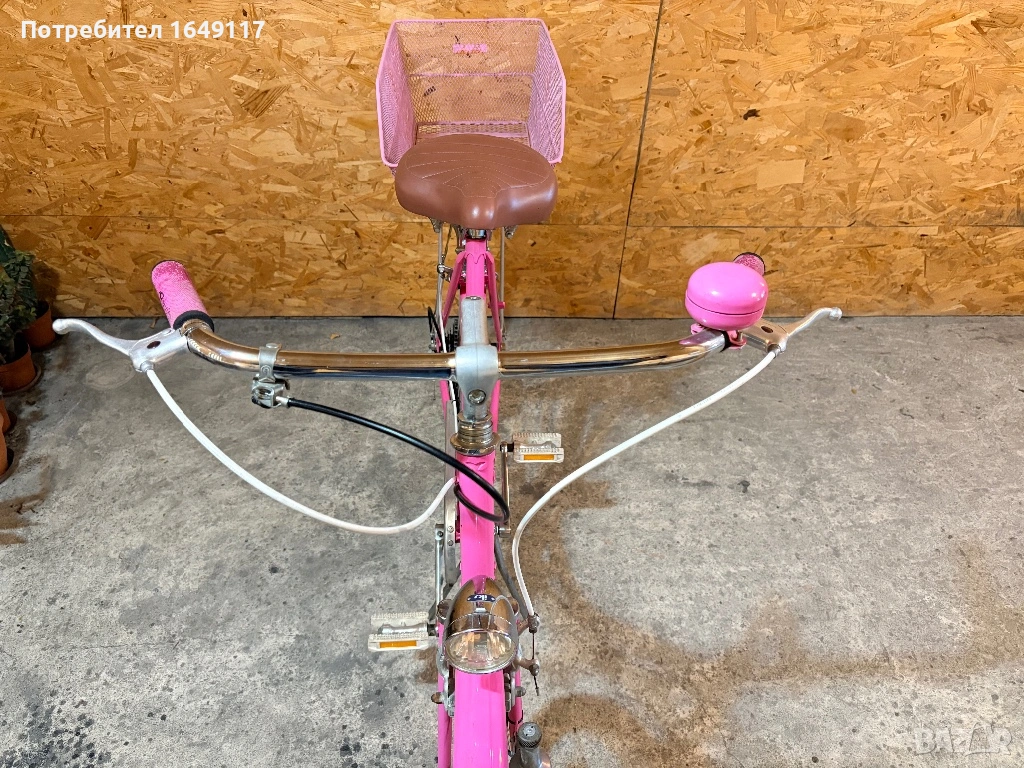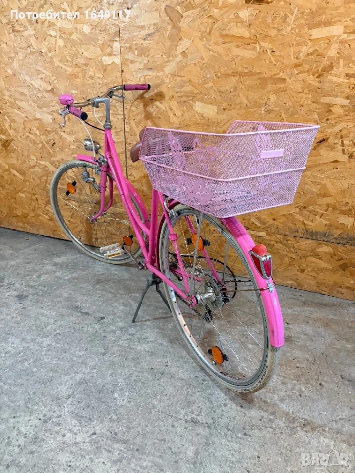 Продавам 28цола, съвсем малко употребяван дамски-градски vintage велосипед. Олекотена, тънкостенна рамка - 52см[стлобка на муфи], с ниско прекрачване. Външни скорости SACHS Huret - 5бр. c палцовa командa. Никелирани курбели с алуминиеви педали. Широка ергономична седалка Felt. Алуминиеви капли с бели гуми Schwalbe Delta Cruiser с усилен профил. Предна и задна алуминиеви челюстни спирачки. Широко кормило с алуминиева лапа.