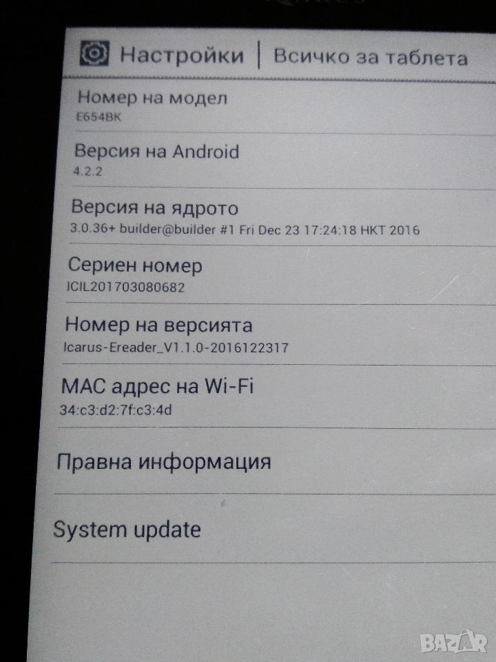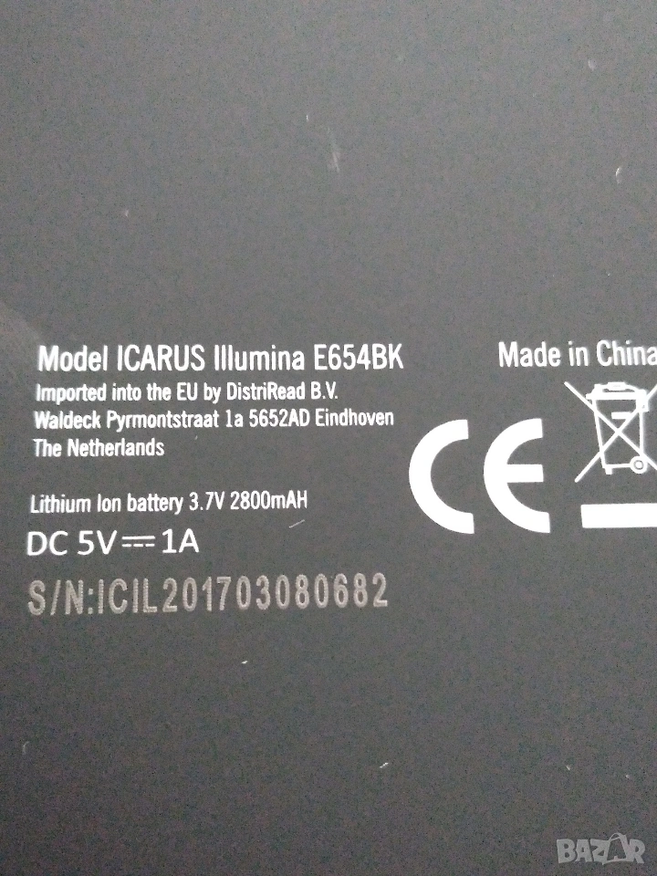 ICARUS Illumina E654BK (пуснат на пазара ~2016 г.) е...6-инчов електронен четец E Ink Carta с тъчскрийн, работещ с Android 4.2 и достъп до Google PlayТой се отличава с дизайн с вградена рамка, предно осветление, резолюция 1024x768, 1GHz процесор, 512MB RAM, 8GB памет и MicroSD разширение, което го прави лесно персонализируемо и лесно за използване устройство за четене. Основни характеристики и спецификации: Екран: 6-инчов E Ink Carta дисплей с плавна рамка, резолюция 1024 x 768 (не висока 300 PPI). Операционна система: Android 4.2.2 Jelly Bean, позволяваща инсталиране на приложения на трети страни (Kindle, Kobo и др.). Светлина: Вградена предна светлина за удобно четене в тъмна среда. Производителност: 1GHz двуядрен процесор с 512 MB RAM. Памет: 8 GB вътрешна памет, разширяема чрез microSD карта. Дизайн: 118 x 168 x 9 мм, тегло 197 грама. Това устройство е проектирано да бъде отворено, което позволява на потребителите да надхвърлят вградената библиотека и да използват приложения от Google Play Store. То е третото поколение на 6-инчовата серия Illumina, заместваща E753BK, и беше похвалено за баланса между отворени възможности за Android и прилична технология на екрана при пускането си на пазара.