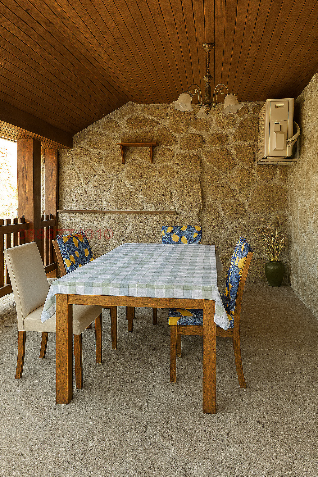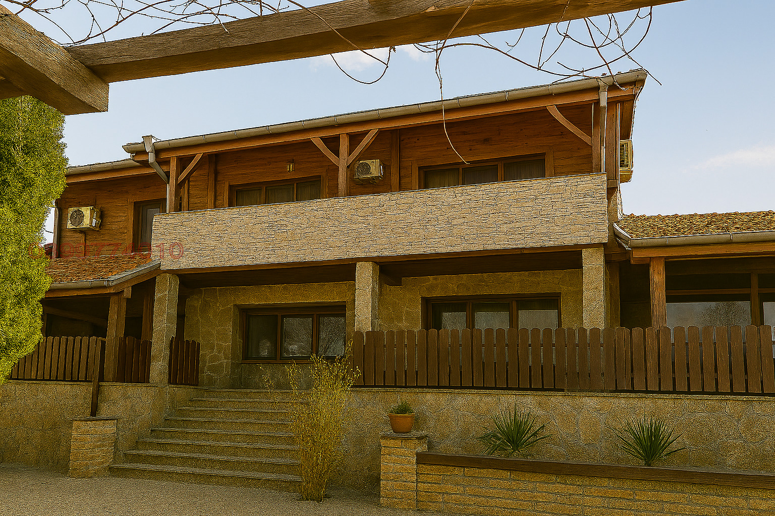 Двуетажна самостоятелна къща под наем, разположена в общ двор с втора жилищна постройка. На първия етаж са обособени дневен тракт, кухня и баня с тоалет. На втория етаж са разположени три спални, баня и отделна тоалетна. Имотът се предлага напълно обзаведен.