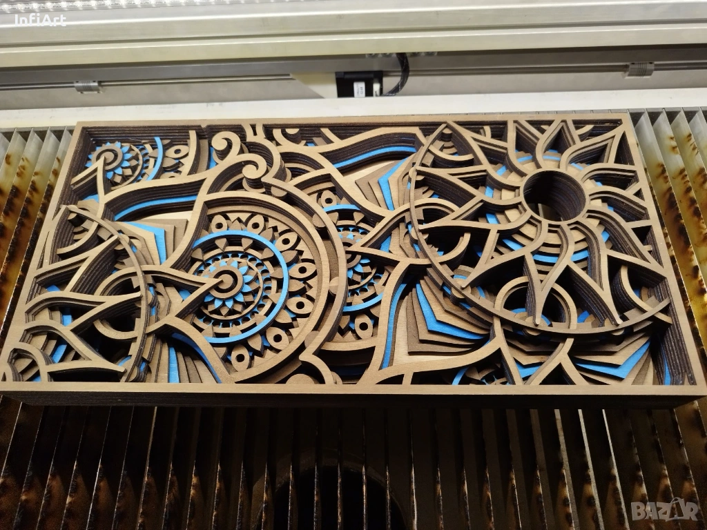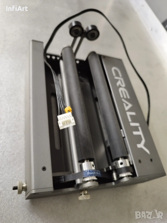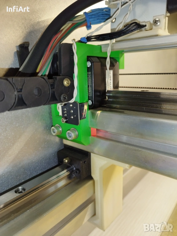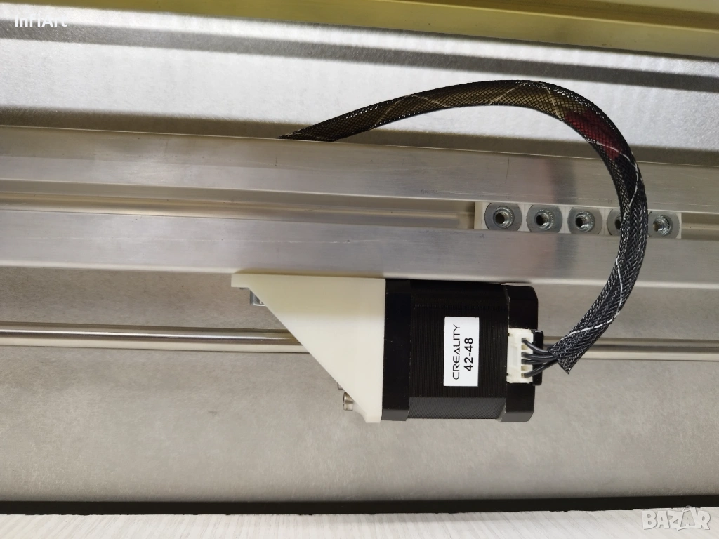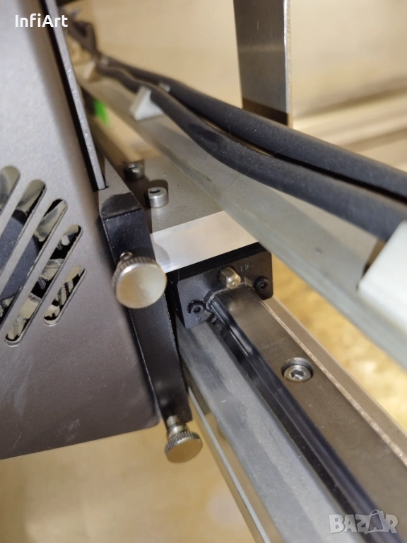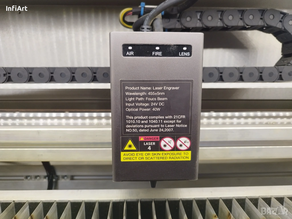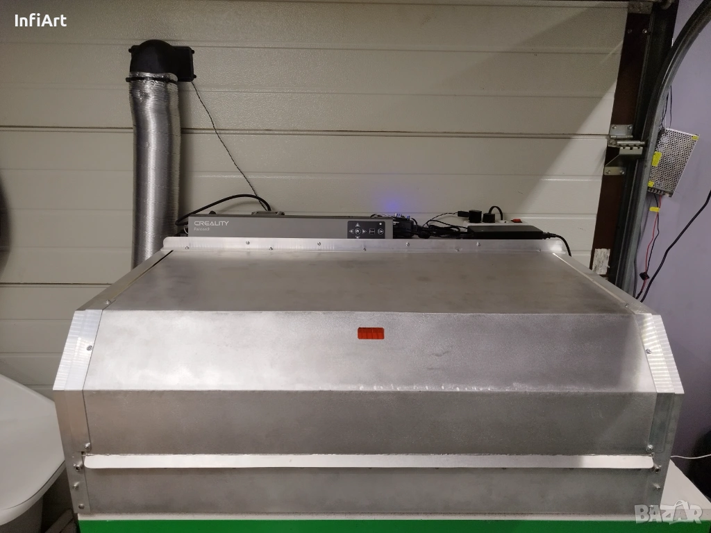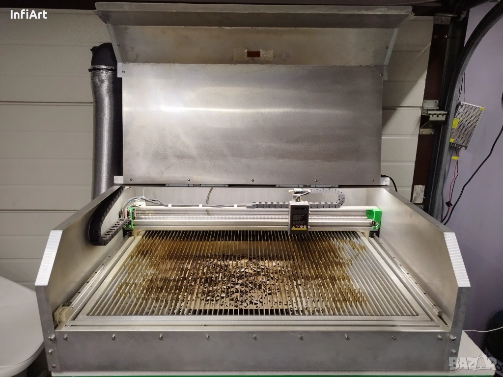 Машината е изградена на базата на Creality Falcon 2 – 40W (лазерният модул е напълно оригинален и непокътнат). Рамката е увеличена до по-голямо работно поле. Лазерът може при желание да бъде върнат в оригиналната конфигурация и да работи без проблем.