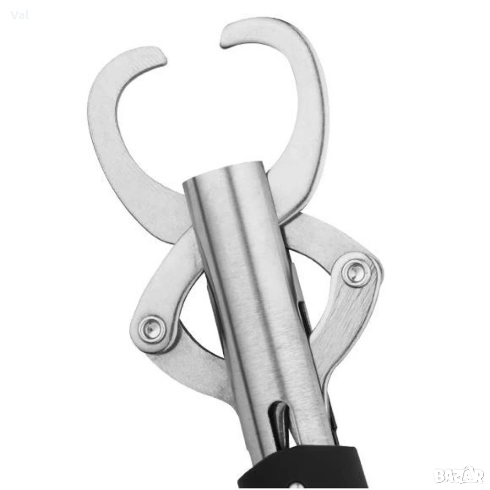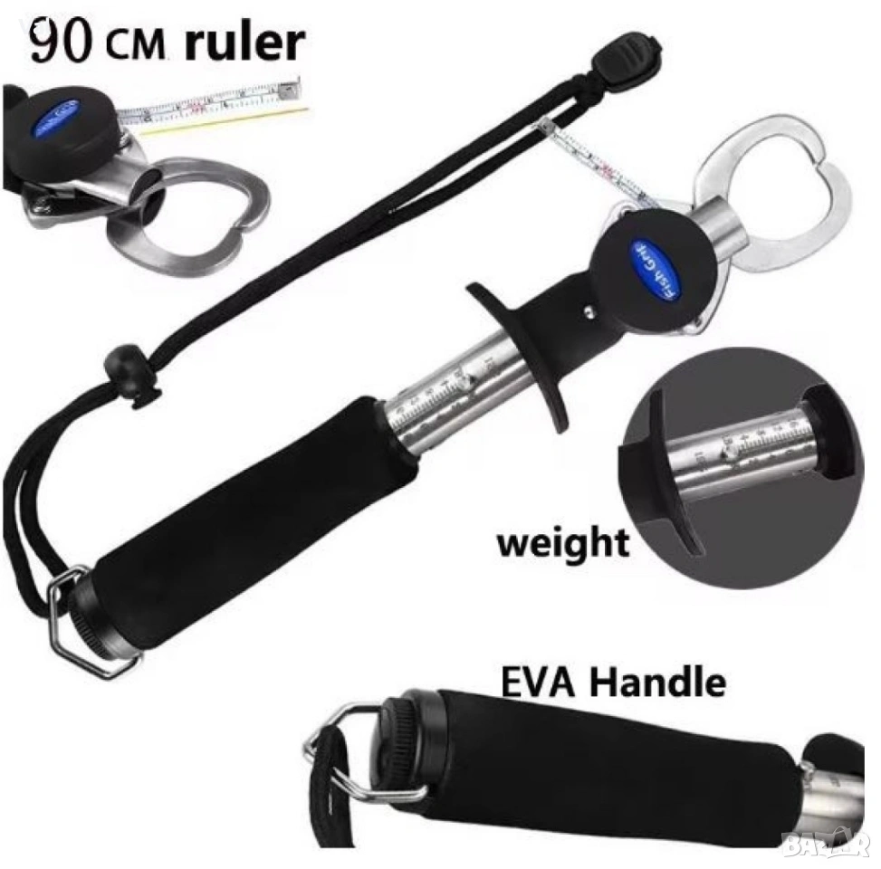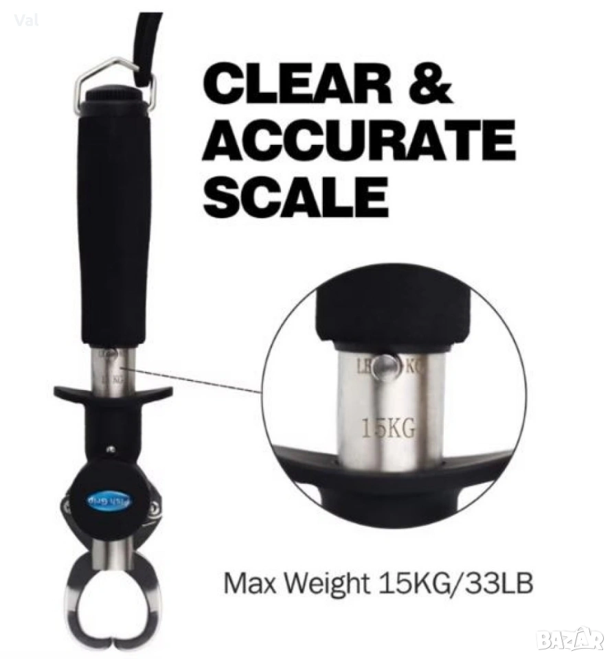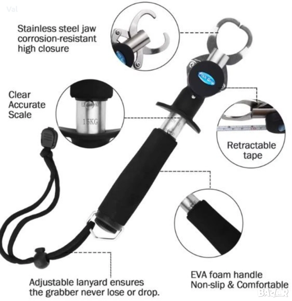 Материал: Здрава стомана; Максимално тегло на кантара: 15 кг; Дължина: 25 см; Тегло: 300 грама; Цвят: Сребристо-черен; Функции: Измерване на теглото, задържане и манипулиране на хищни риби; Особености: Гумирана дръжка, връзка за китката, мощна пружина, здрави челюсти; Вариант 1: С кантар; Вариант 2: Без кантар.