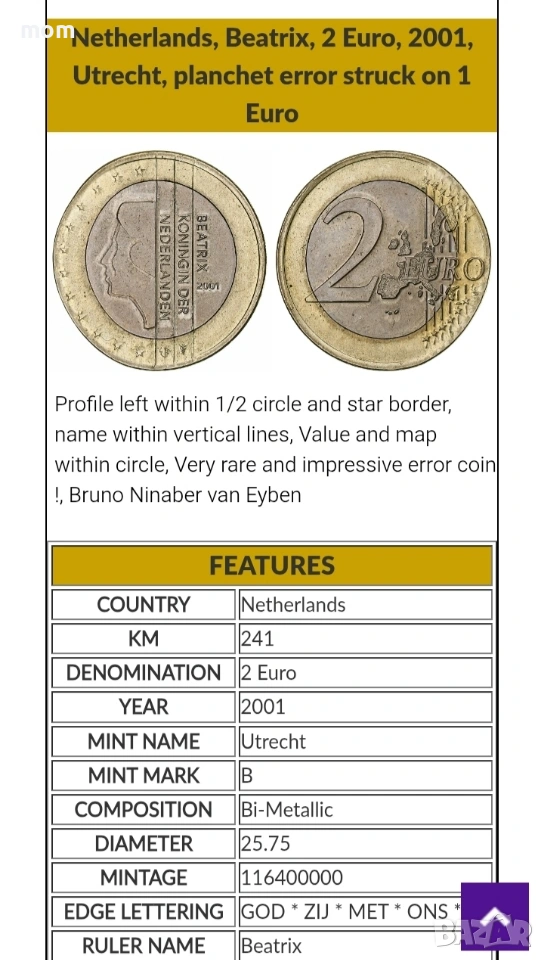 Монетата от 2 евро на Нидерландия от 2001 г. изобразява кралица Беатрикс и е много търсена сред колекционерите, тъй като монетите с дата 2001 г. са били емитирани предимно в официални комплекти от монетния двор преди официалното пускане на еврото през 2002 г.