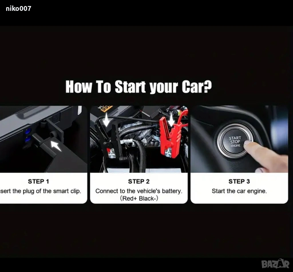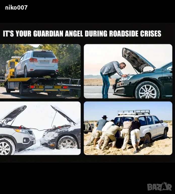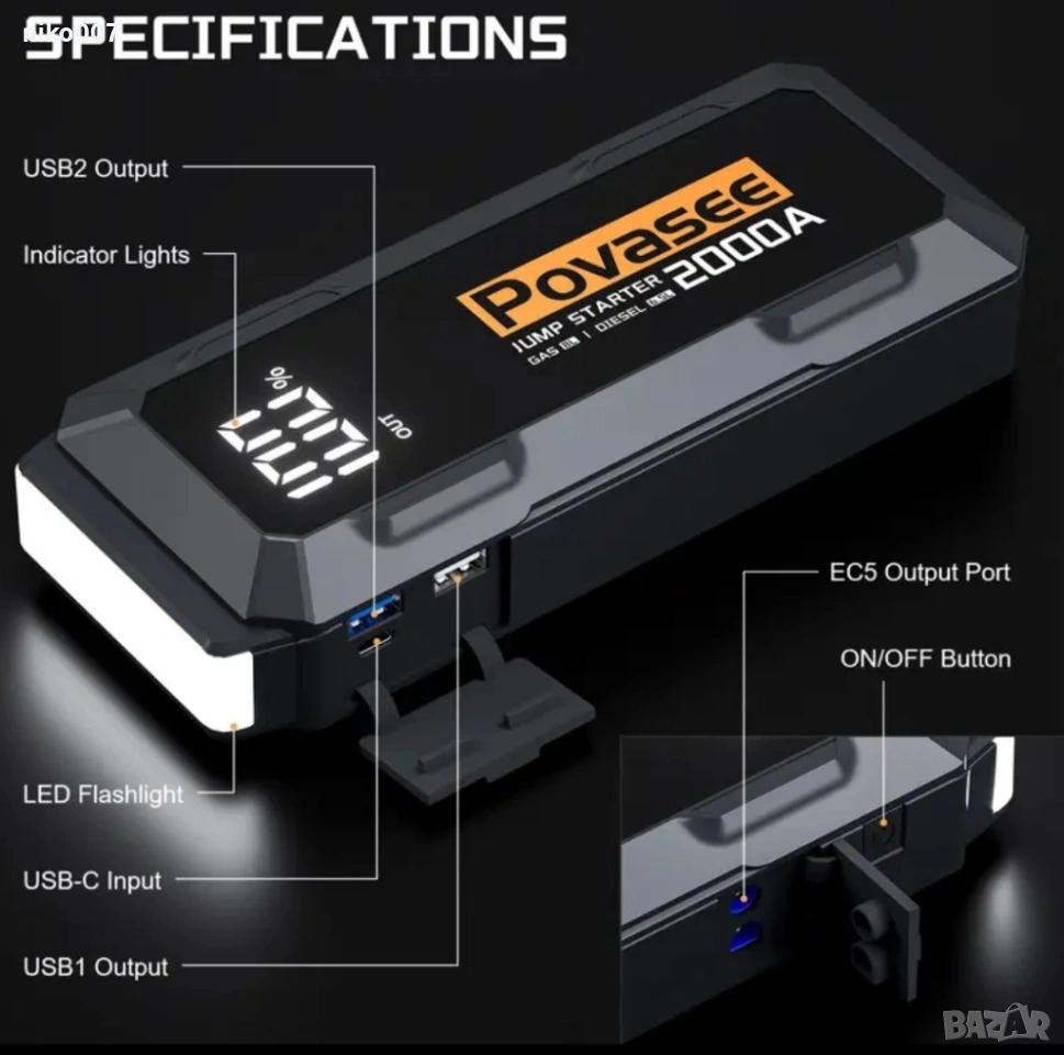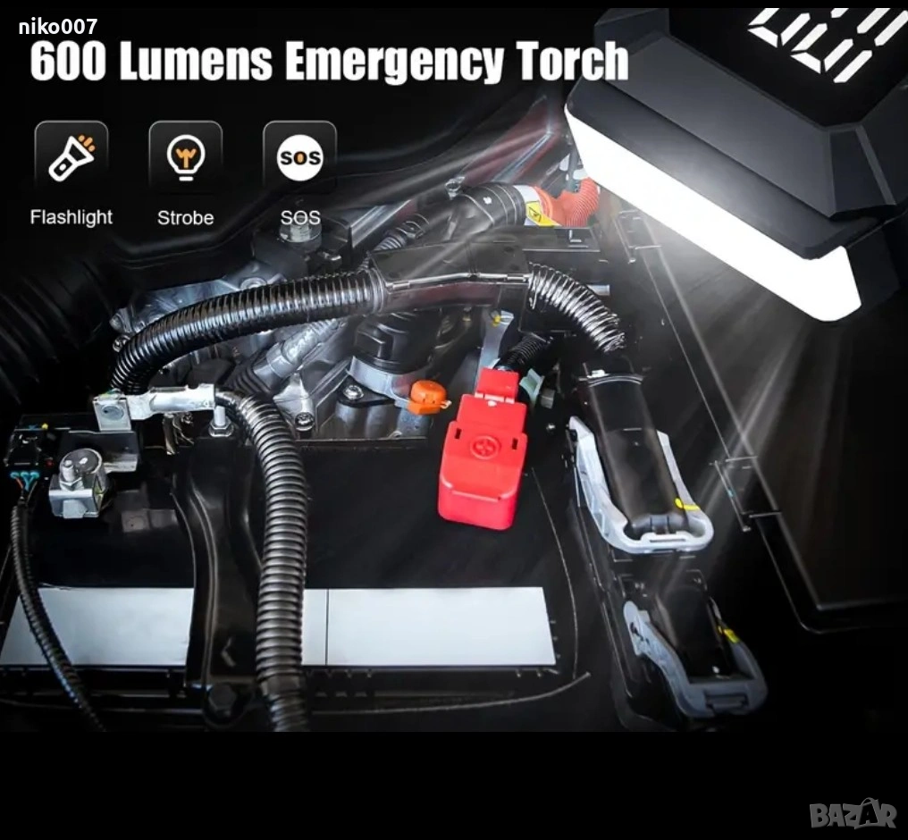 Това устройство може да се ползва за подаване на ток ако колата ви е с паднал акумулатор и не иска да пали.Пали за секунди без значение на температурата и времето.Има вграден фенер.Може и да се ползва като външна батерия за да си заредите телефона.
