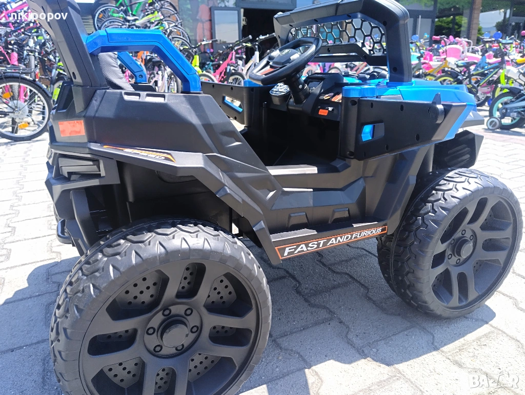 Играчката е с реалистичен дизайн и има 4 гуми от EVA пяна. Отвътре е със стилни седалки, а вратите ѝ се отварят, досущ като на истинска джипка. Колата е оборудвана с бутон за старт, предни и задни светлини, има и предпазен колан. Може да се движи напред и назад и има три скорости на движение, които се регулират от дистанционното управление. За още по-голямо забавление има порт за USB и MP3 за възпроизвеждане на музика.