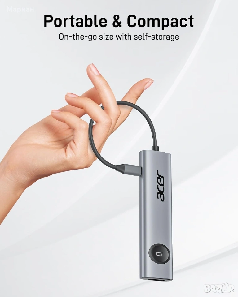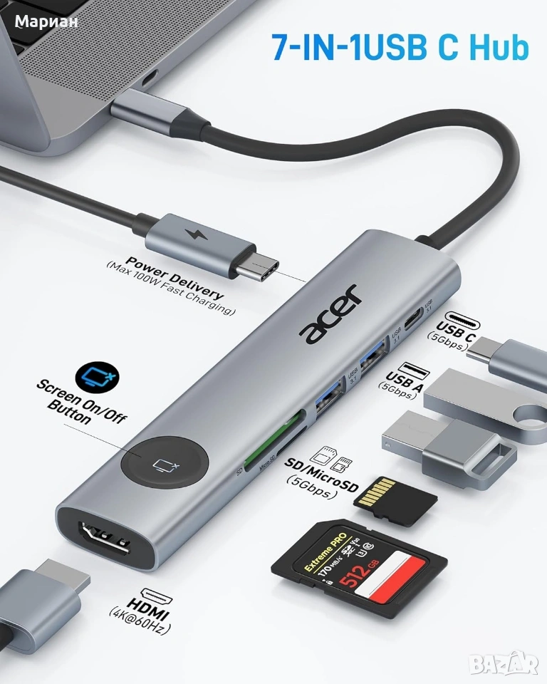 Acer USB C Hub, 7-в-1 USB C към HDMI адаптер 4K@60Hz, 2 * 5Gbps USB 3.0 и Type-C порт за данни, 100W PD, четец на SD карти, бутон за включване/изключване на екрана, съвместим с MacBook Pro/Air, iPad Pro/Air, Switch, XPS [7-в-1 многопортов USB C хъб] Acer USB C хъбът е изработен от алуминий и разширява един USB-C порт до 7 порта (1*HDMI 4K@60Hz, 2*USB 3.0, 1*USB-C порт за данни, 1*Type-C PD зареждане, 1*MicroSD слот за карта, 1*SD слот за карта). Този USB-C адаптер със 7 порта може напълно да отговори на вашите нужди от работа от дома, офиса или в движение.