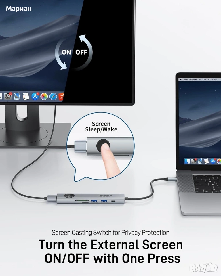 [Функция за защита на поверителността] Уникалният бутон за заспиване на външния екран на Acer USB-C Splitter е удобен за работа в офиса. Ако получите лично съобщение, натиснете бутона, за да изключите екрана и да заглушите звука само с едно щракване. След като се заемете с личните си въпроси, натиснете го отново, за да възобновите споделянето на екрана, предотвратявайки потенциално неудобство.