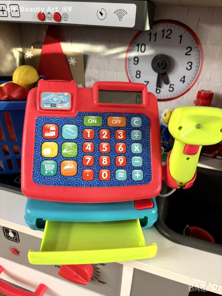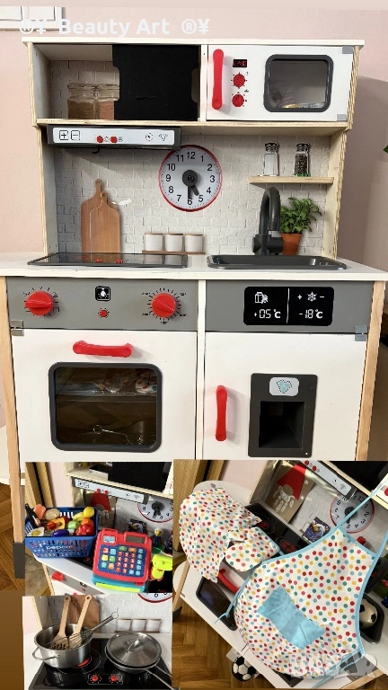 Детска дървена кухня в отлично състояние, всички звуци и светлини работят ( на котлоните , на абсорбатора) Аксесоарите са подарък към кухнята и включват - каса за маркиране с парички , кошница с продукти , тенджера , тиган , черпаци , престилка , ръкавица и подложка. Кухнята се намира в гр София и предпочитам лично предаване .