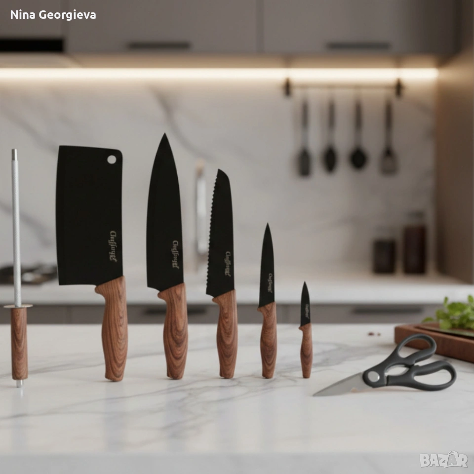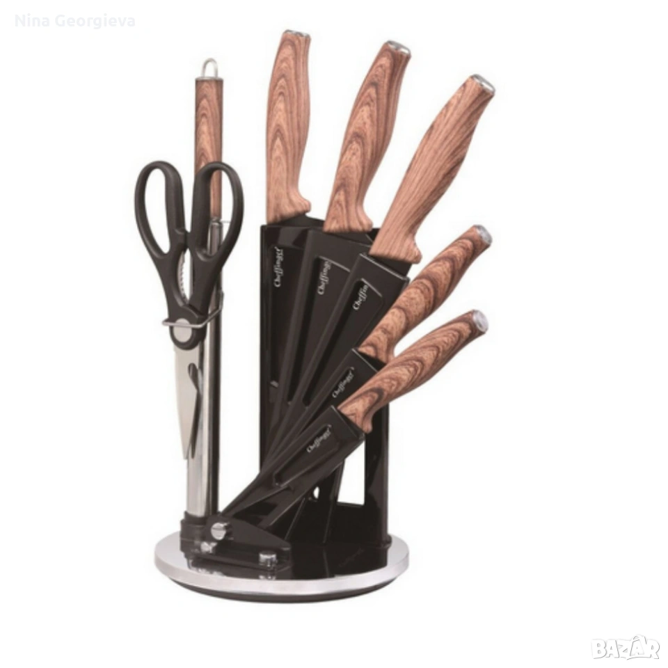 Комплект ножове Cheffinger – 8 части със стойка, точило и ножица за подредена и удобна кухня