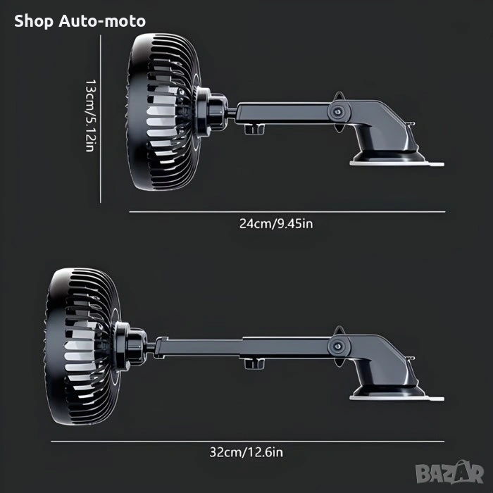 Благодарение на вакуумната стойка, вентилаторът се закрепва стабилно към таблото или предното стъкло, осигурявайки надеждна фиксация по време на движение. Регулируемото рамо и 360° въртящата се глава позволяват лесно насочване на въздушния поток към водача или пътниците за максимален комфорт по време на пътуване.
