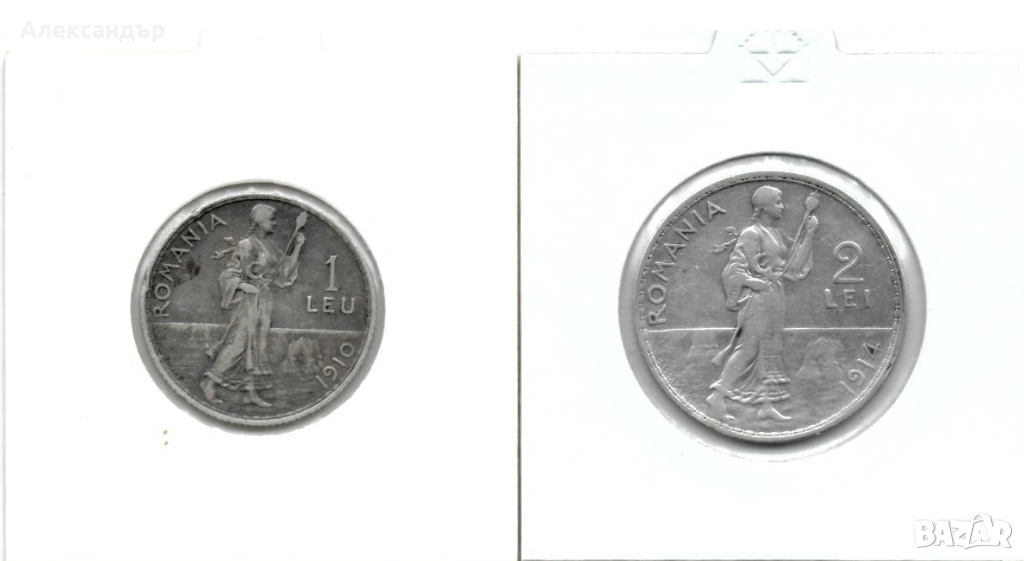 1 лея 1910, 2 леи 1914 Кралство Румъния  Сребро  → Обява 53850438