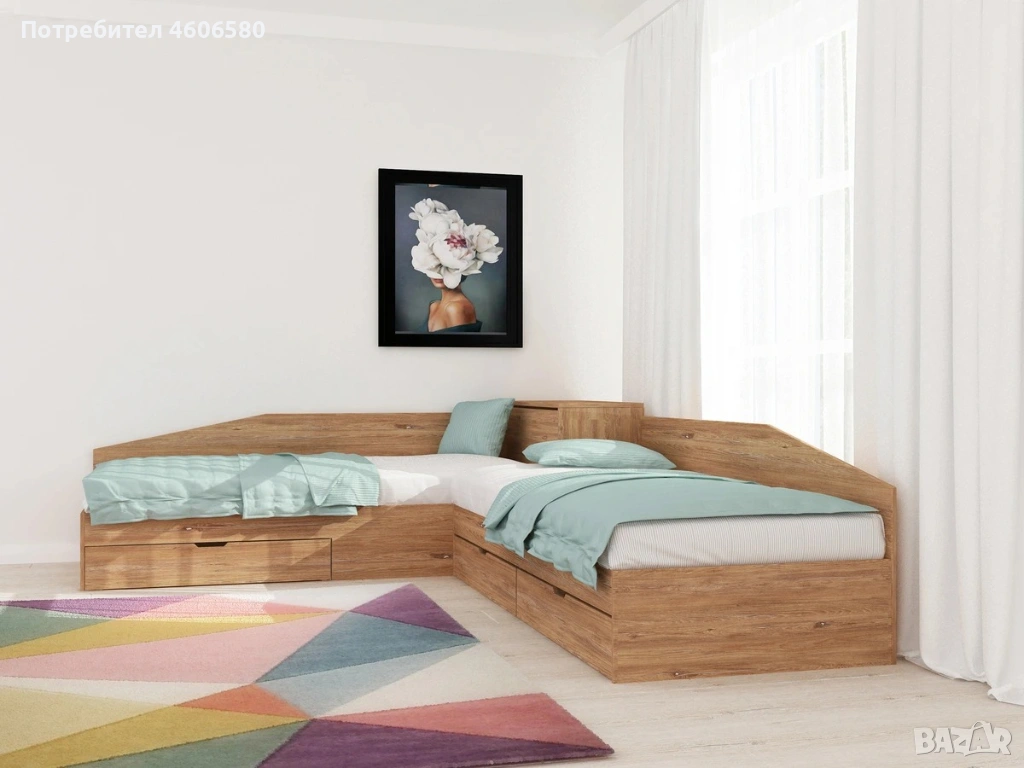 Практично решение за стаи с ограничено пространство. Ъгловото легло използва ъгъла на стаята и освобождава повече място. Под леглото има чекмеджета и ракла за съхранение – идеални за спално бельо, завивки или дрехи.