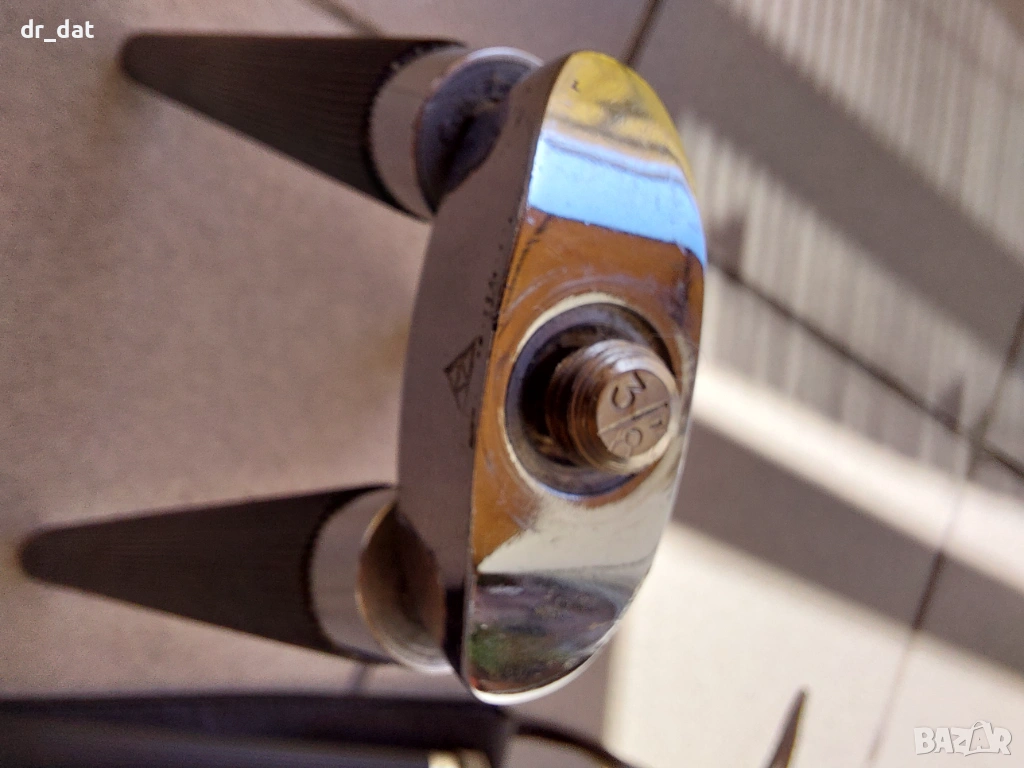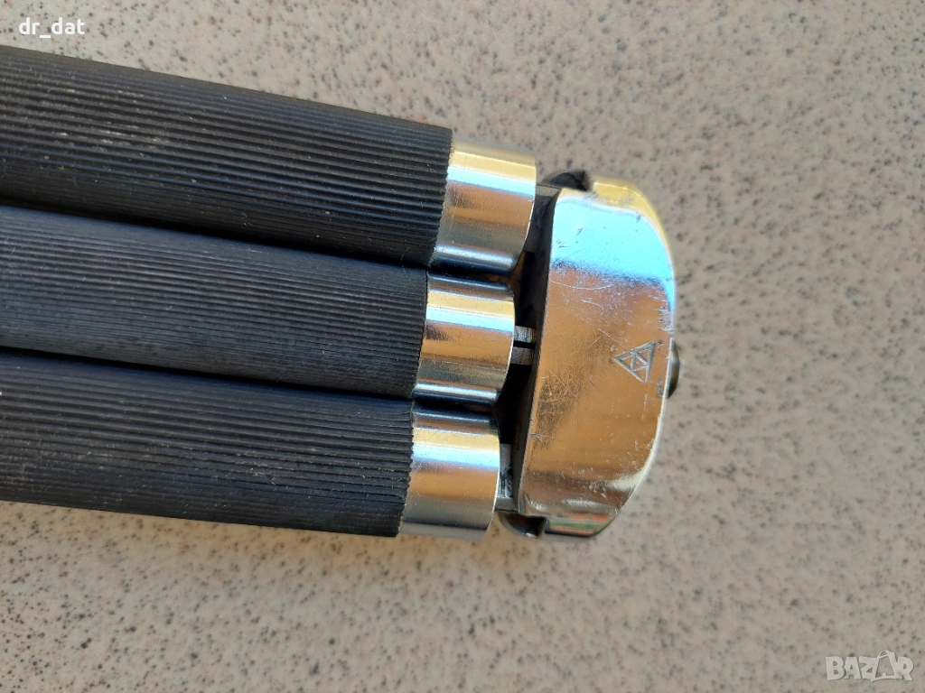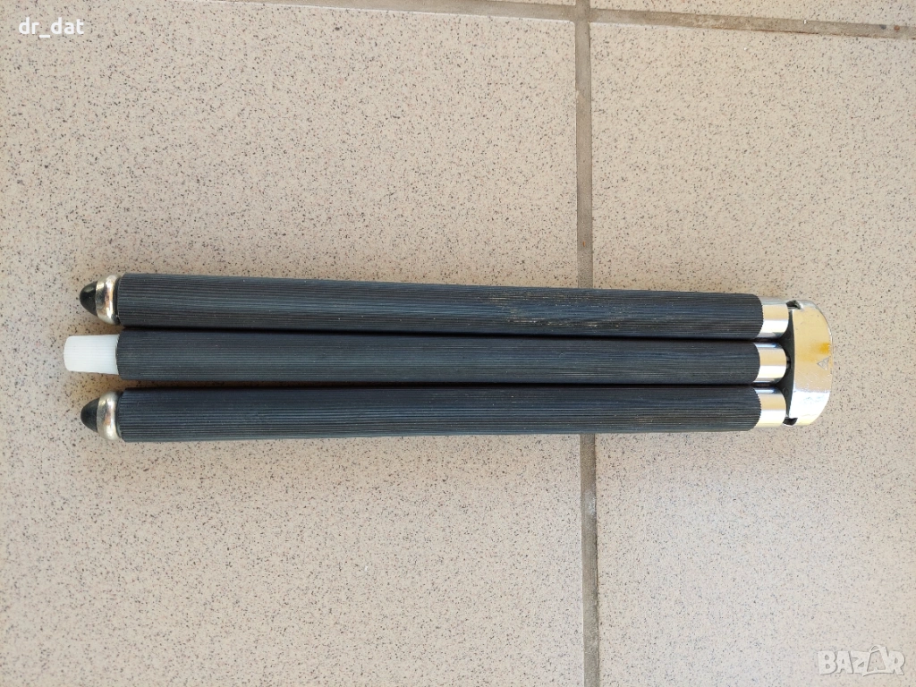 Стар трипод за фотоапарат. Не знам марката - има само някакъв знак, който се вижда на снимките. Доста стегнат е.