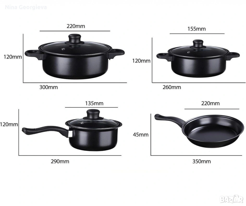 Комплектът е изработен от висококачествена желязна сплав, с незалепващо покритие отвътре, капак от закалено стъкло и топлоизолирани дръжки отвън, черен външен вид, класически и лесен за използване;