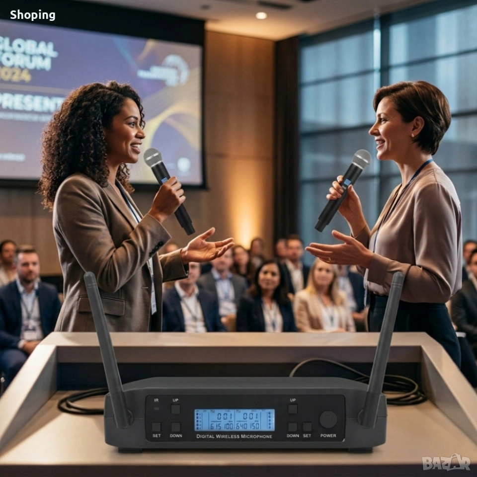 Технически характеристики на Комплект 2 броя безжични микрофони и UHF приемник с дисплей Основни спецификации Честотна лента: 740–790 MHz, 200 налични честоти. Работен обхват: до 60 м при пряка видимост. Динамичен диапазон: > 100 dB. Честотна характеристика: 80 Hz–18 kHz (±3 dB). Захранване микрофони: 2×AA батерии (в комплекта — 4× AA/LR6), до 16 ч. работа. Изходи приемник: XLR и 6,3 мм жак с регулиране на нивото на звука. Работна температура: -10 °C до +50 °C. Размери приемник: Ширина 183 мм, Дълбочина 117 мм, Височина 40 мм. Дължина на ръчния микрофон: ~250 мм, диаметър на главата ~51 мм.