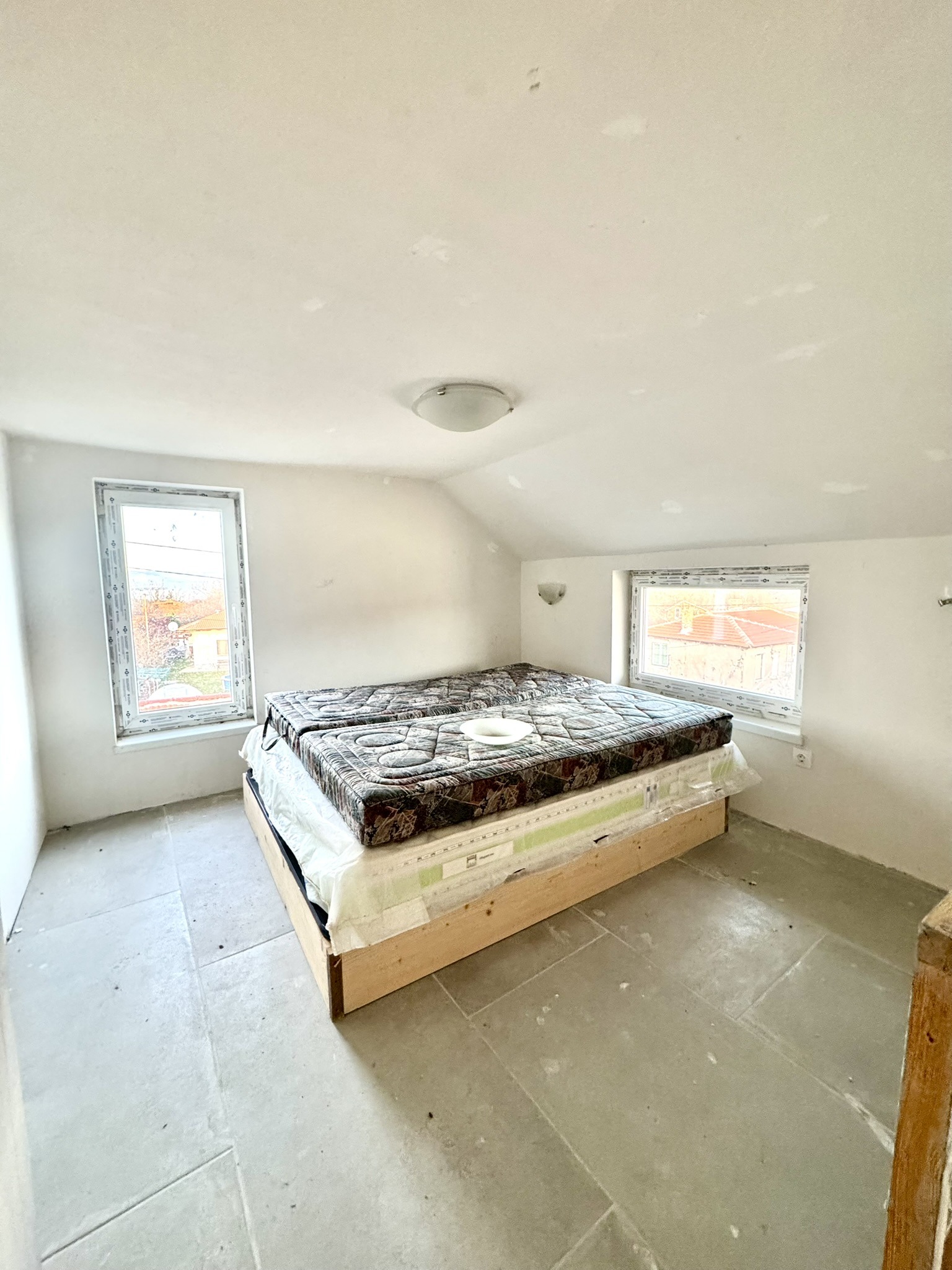 Трети етаж: две спални, баня с тоалетна, частично скосени тавани, придаващи уютен характер
