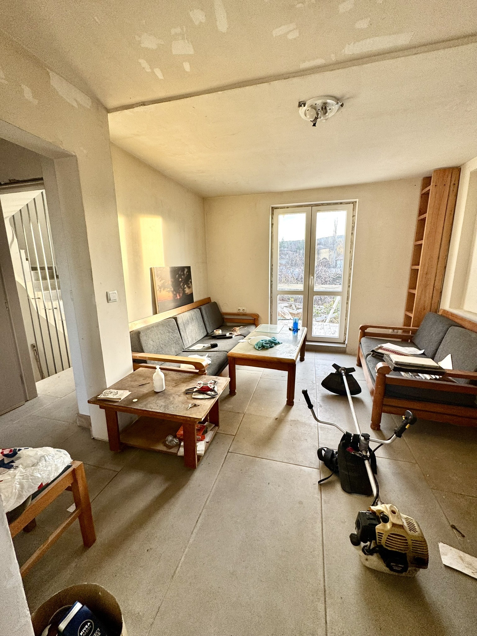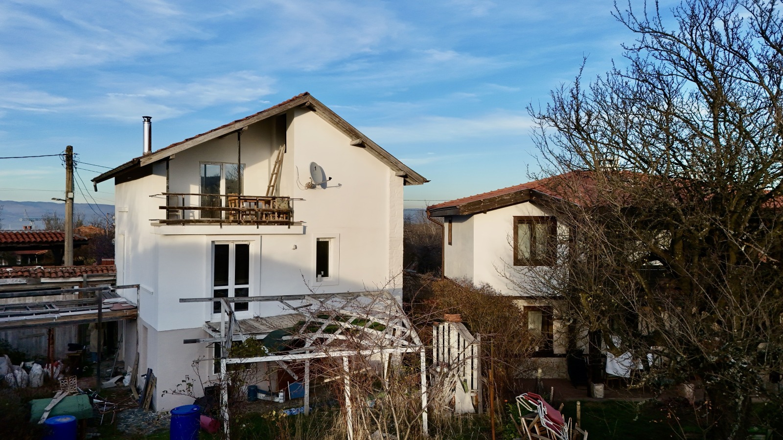 Състояние и подобрения: сменена дограма, външна топлоизолация, нов покрив, изградена отоплителна инсталация с камина с водна риза, подово отопление с настилки от гранитогрес, изцяло подменени електро- и ВиК инсталации, баните са завършени на около 90%, с монтирани уреди и смесители, вътрешните стени имат нужда за финна шпакловка и боядисване.