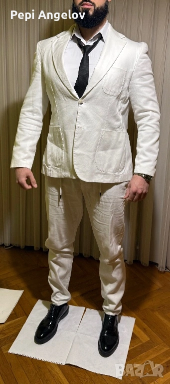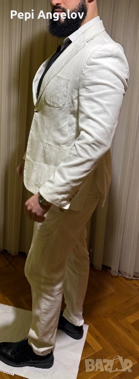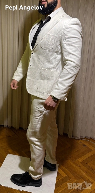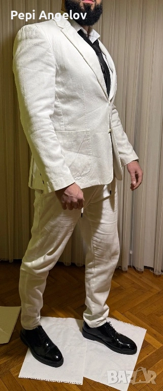 Продавам елегантни мъжки костюми, носени само по специални поводи. Един от тях е абитуриентският ми костюм. Към всички от костюмите има и подходящи официални обувки.Пълен комплект ! Цена 250 евро за този бял костюм !