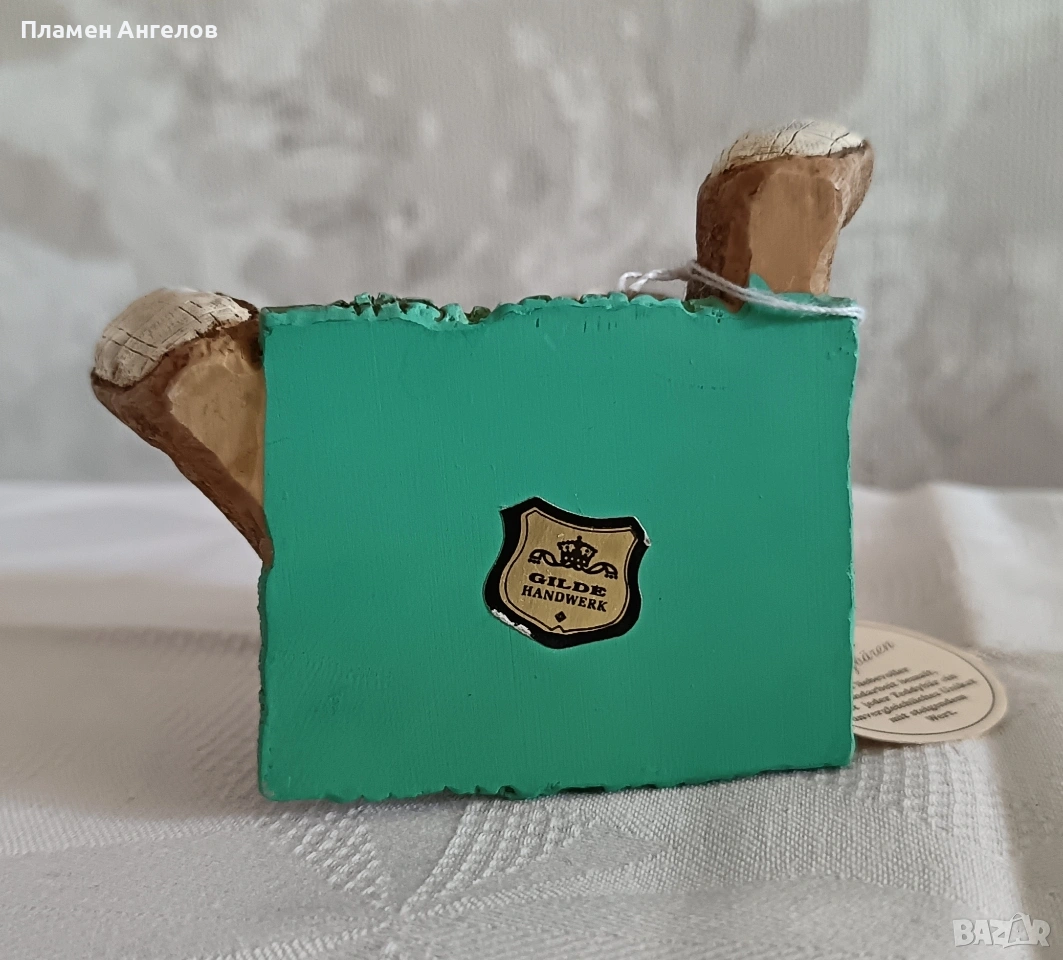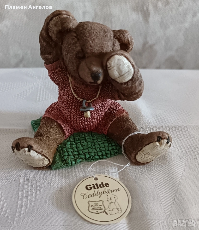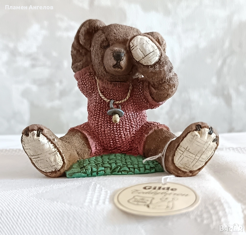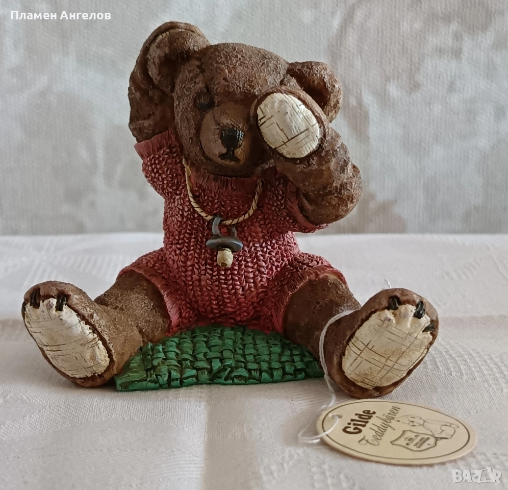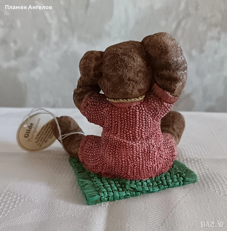 Оригинална колекционерска фигурка от популярната серия Gilde Teddybaren на немската марка Gilde Handwerk. Модел :Gilde Baby Pink (N:37006).Състояние отлично без забележки. Без чипове. Без пукнатини, без укърнения, без ужулвания и протривания. Стояла е във ветрина без следи от годините. Разполага с етикети за автентичност. Тези фигурки са ръчно изработени, ръчно рисувани, което ги прави неповторими и всяка една е произведение на изкуството. Цената е твърда, без коментар.