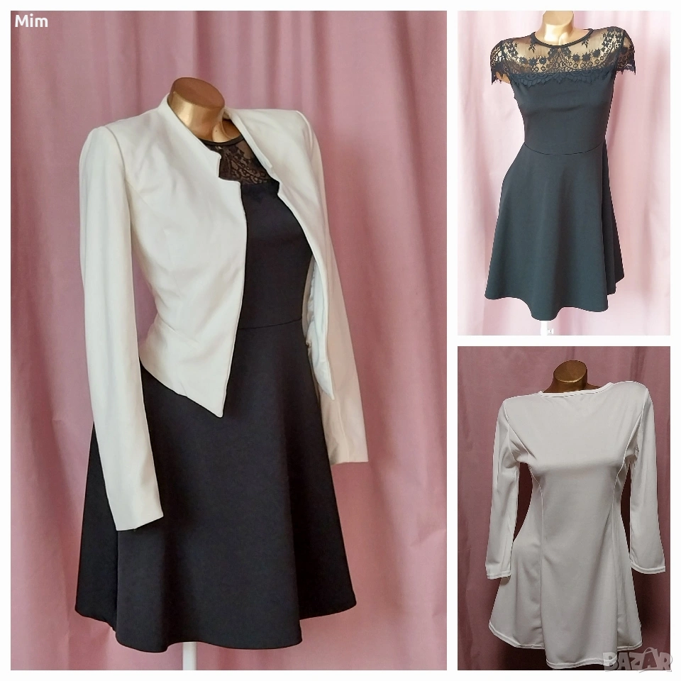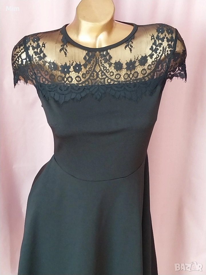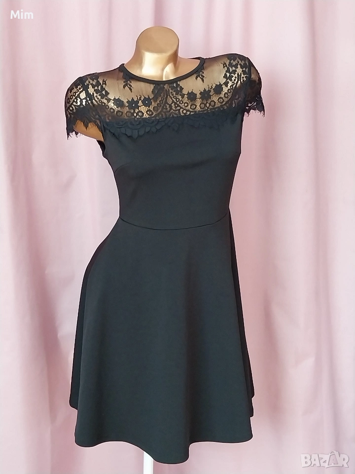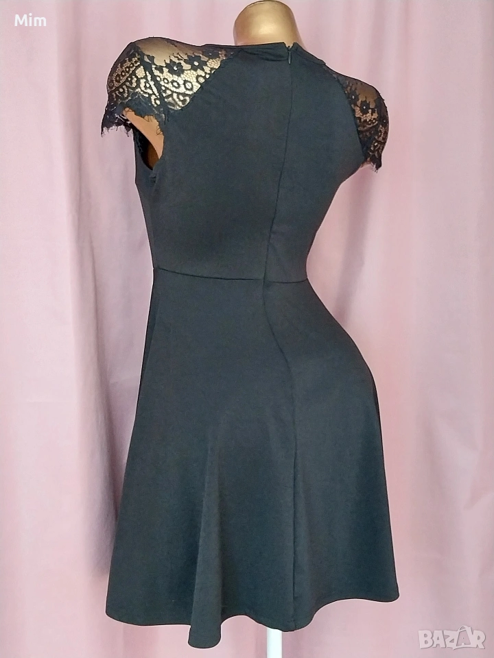 1- S Черна къса еластична рокля с дантела над бюста ,Гръдна от 90 до 100 см еластичност, талия 79 до 80 см еластичност, дължина 80 см ,закопчаването е отзад с цип
