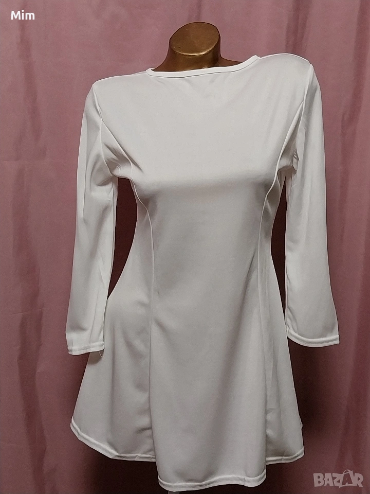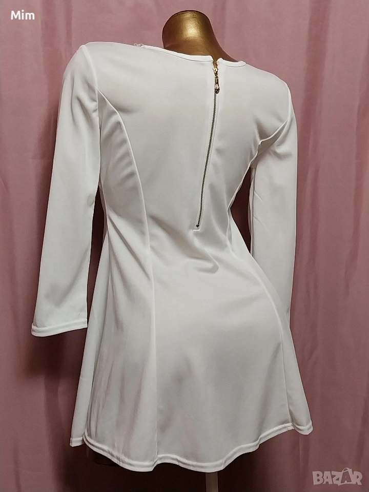 2- Бяла, еластична рокля с дълъг ръкав, закопчаването е отзад с метален златист цип. гръдна 90 до 110 см еластичност, талия 70 до 80 см еластичност, дължина 73 см ,дължина на ръкавите 48 см