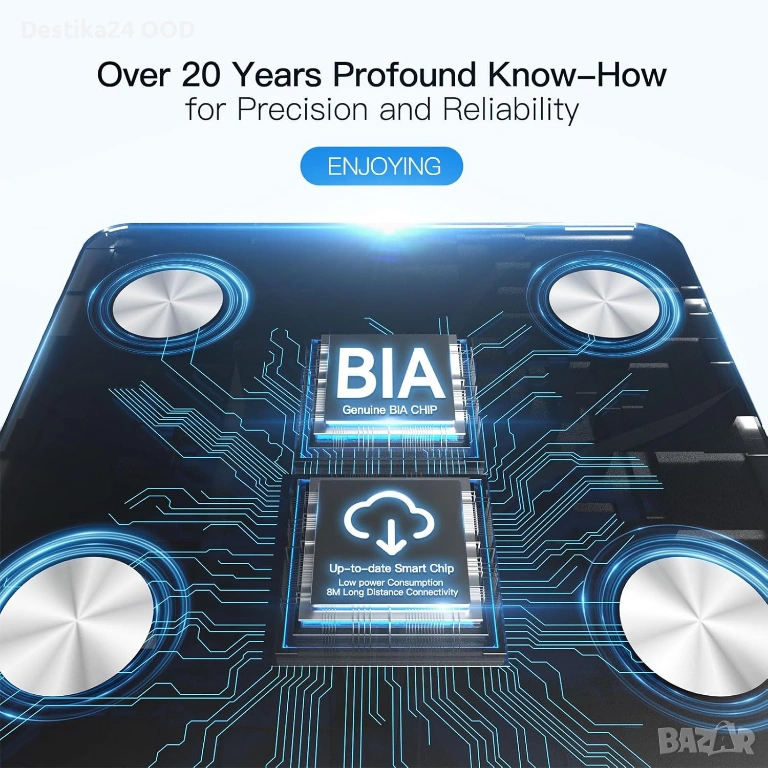 Кантарът използва BIA технология (биоелектричен анализ) за по-точно измерване на телесния състав.