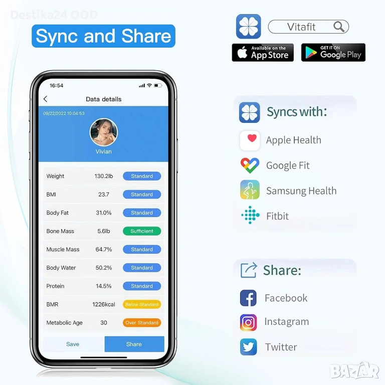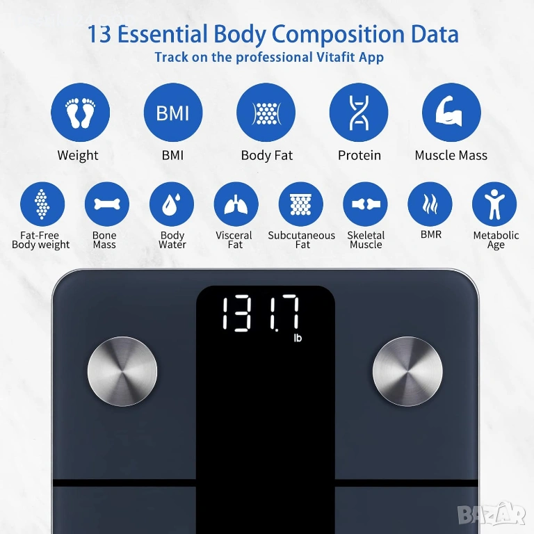 Смарт кантар Vitafit за измерване на тегло и телесен състав с висока точност. Кантарът се свързва с мобилно приложение чрез Bluetooth и позволява проследяване на различни показатели за здравето и фитнеса.